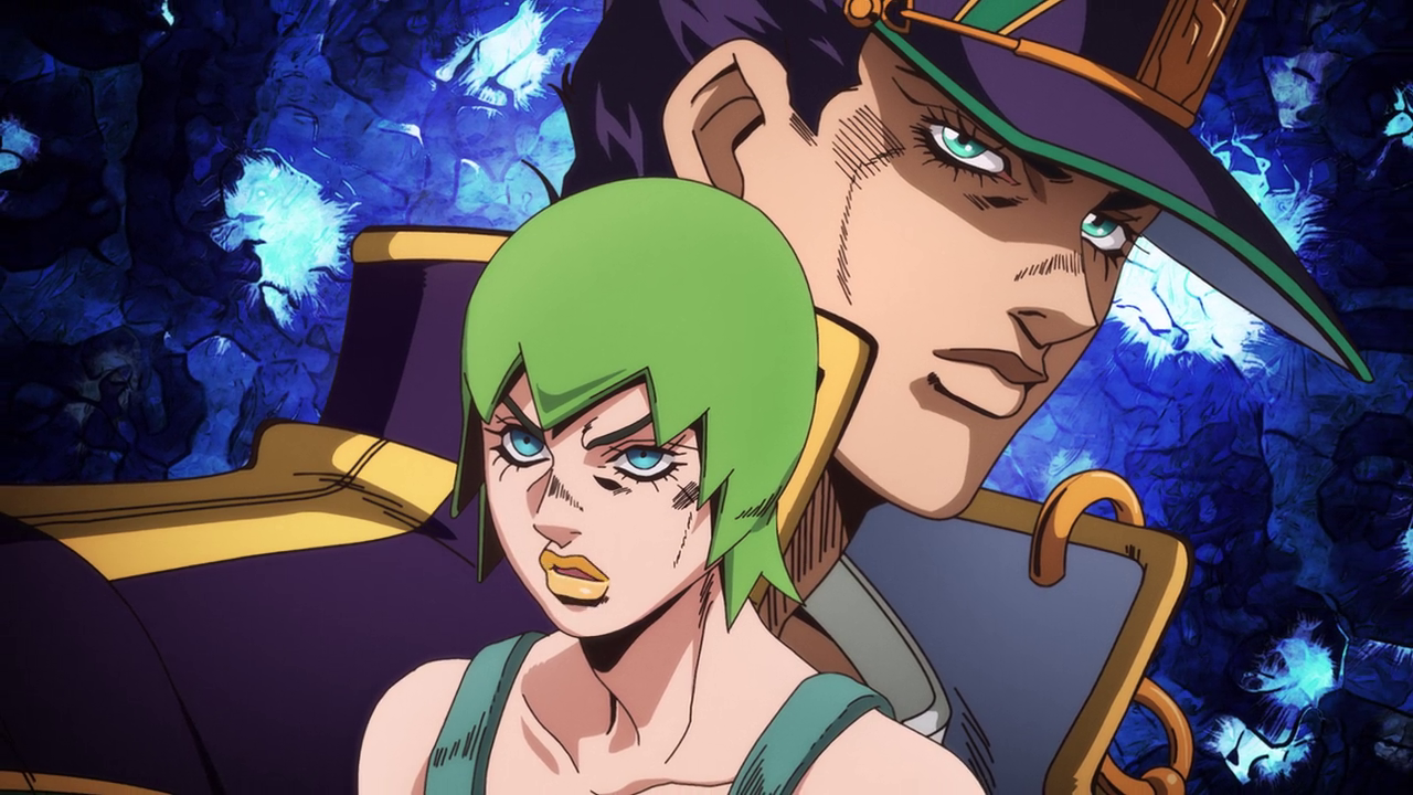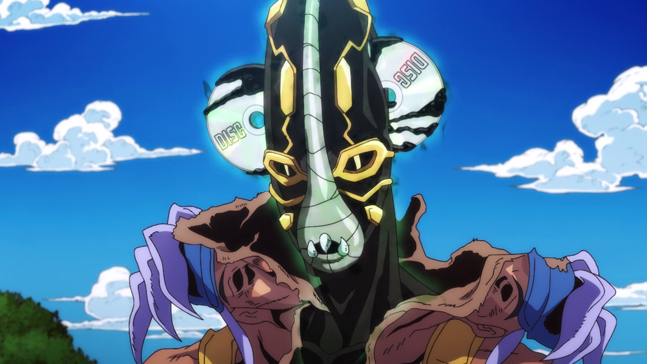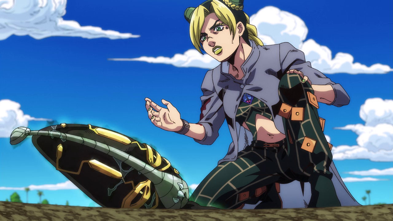 I knew the mystery sixth person in the group was the woman in the tank top since we had seen the other ladies in the shot where Jolyne and Hermes run to catch up to the jeep. But man that whole scene in the beginning with their bodies getting sucked of their moisture and all that was horrifying. I didn’t remember that particular scene so I wasn’t expecting it, but it was done really well. We find out that Foo Fighters, or F.F., is not a human but an organism with intelligence. After that long existential speech, FF is basically a stand user that started off as a plankton with intelligence and stuff. But thanks to that it has a pretty big weakness, being that it needs water to survive at all times. It needs a some source of water nearby, such as taking it from the wetlands nearby, or from humans, etc. Maybe not the most exciting fight but there were some good moments.