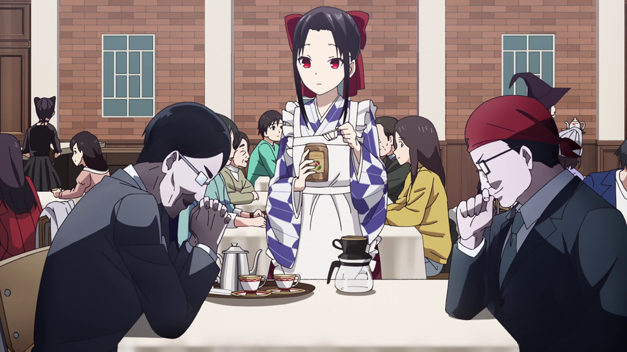 Every Culture Festival in anime has to have the obligatory cosplay cafe and Kaguya is no exception. Though I will say that this was probably the most bogged down part of the episode mostly because of the interaction with the two ramen critics that we met back in season 1. And while the interaction with Chika was funny in season 1, here… I wasn’t really feeling it. Especially when it just felt like it was taking time away from the plot at hand. Just the fact that Kaguya had to prove herself to these two guys she didn’t even know just felt really weird to me. Maybe it was a matter of Kaguya still choosing her pride, but it didn’t feel like it needed to happen, making the interaction more annoying than charming. Though I admit I laughed at Kaguya’s reaction upon seeing Shirogane’s dad again.