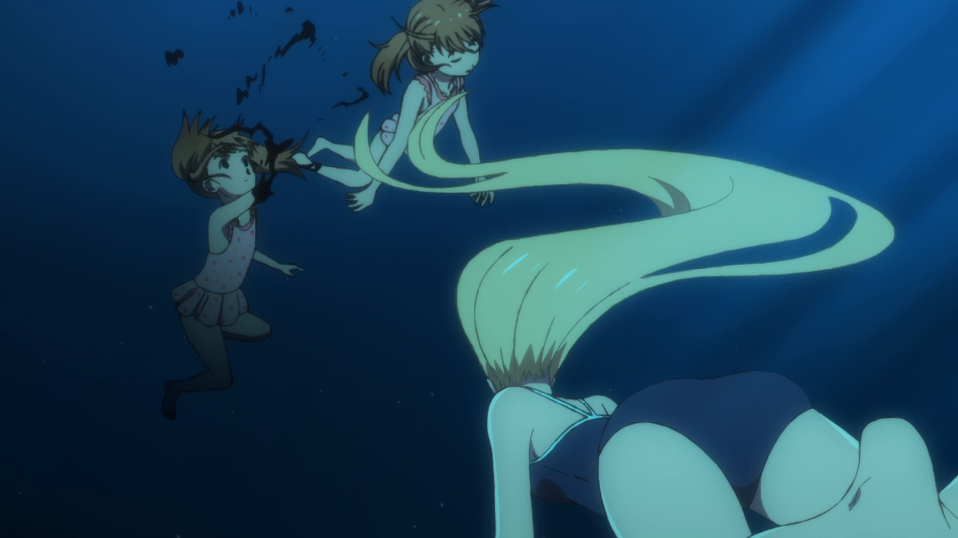 We see that Shadow Ushio was an anomaly from the very start. She didn’t have that malice or creepy disposition that the other Shadows we’ve seen have. Instead, she’s just a perfect copy of Ushio. Same attitude, same humor, same personality, it’s more like they’re twin sisters than anything. Admittedly it was pretty fun watching them together because of how well they got along. Their little banter during the video seemed like something twins would do to mess with other people and it was really entertaining. And I know I just said that I’m not the biggest fan of Ushio, though I have nothing against her. But there wasn’t much to her other than genki clueless girl. This episode helped us see her in another light though. While she still is a very genki person, she’s also very headstrong and caring. She looks after the kids and knowing that Shiori was in danger after finding out that a Shadow needs to kill the original, she did everything she could to save her. She’s a really sweet person with determination, but unfortunately she and her Shadow weren’t able to succeed. Last episode just did not do a good job in characterization for ANYONE really, I’m still puzzled what that episode even was. It was nothing like this or all the other episodes so it leaves a sour taste, but thankfully we were able to get back on track with this one. Because this episode was able to make me appreciate Ushio a lot more, and I’m excited to see how things will develop now that Shadow Ushio’s memories have come back to her. With those memories, her powers have come back to her too and I gotta say I love her hair attack.