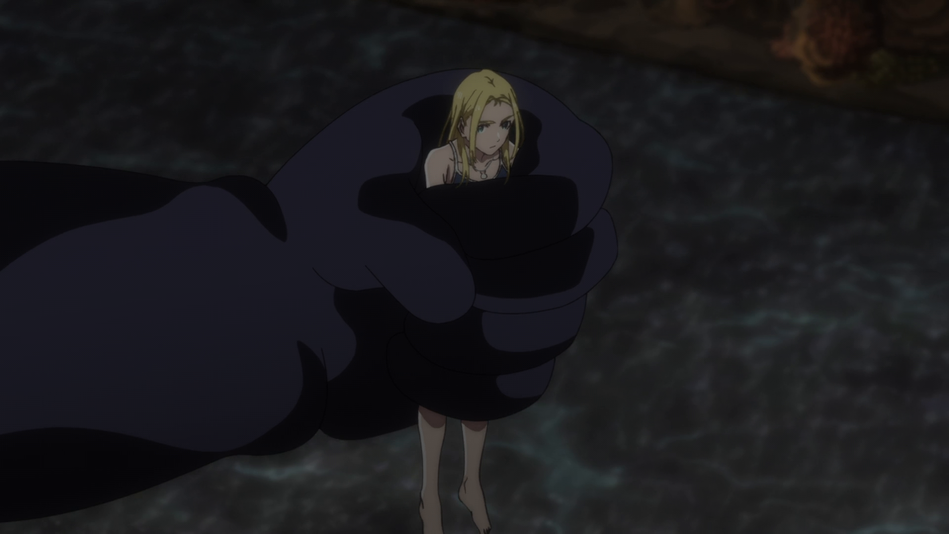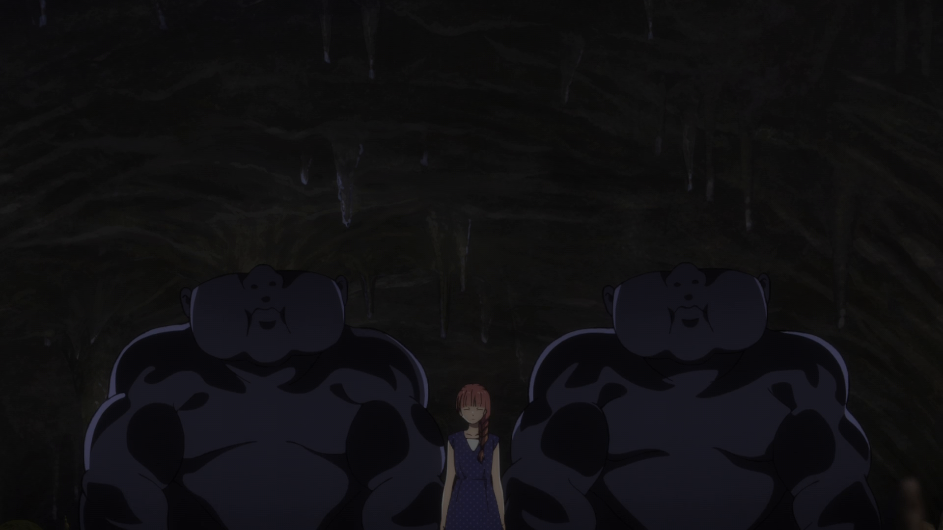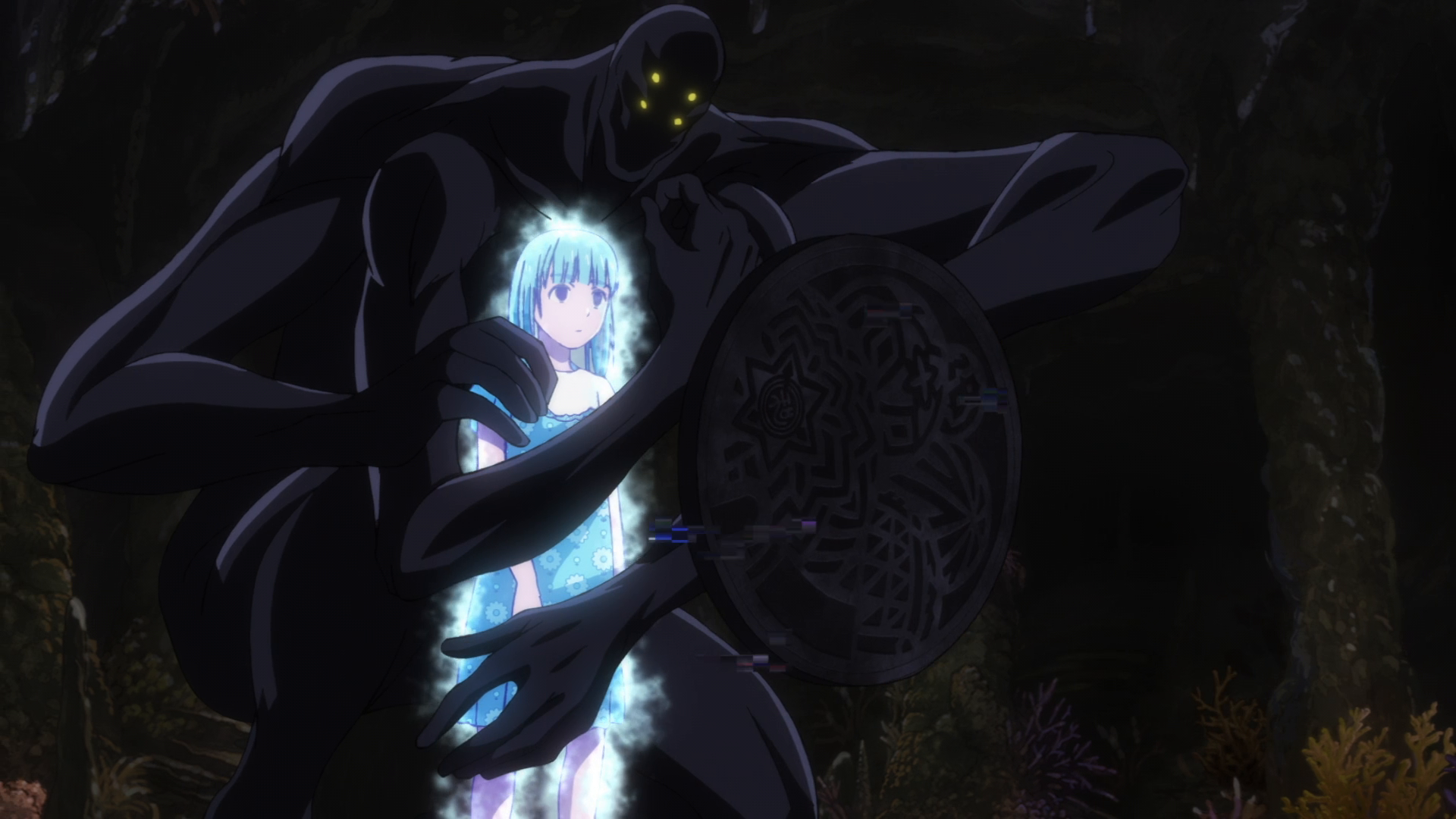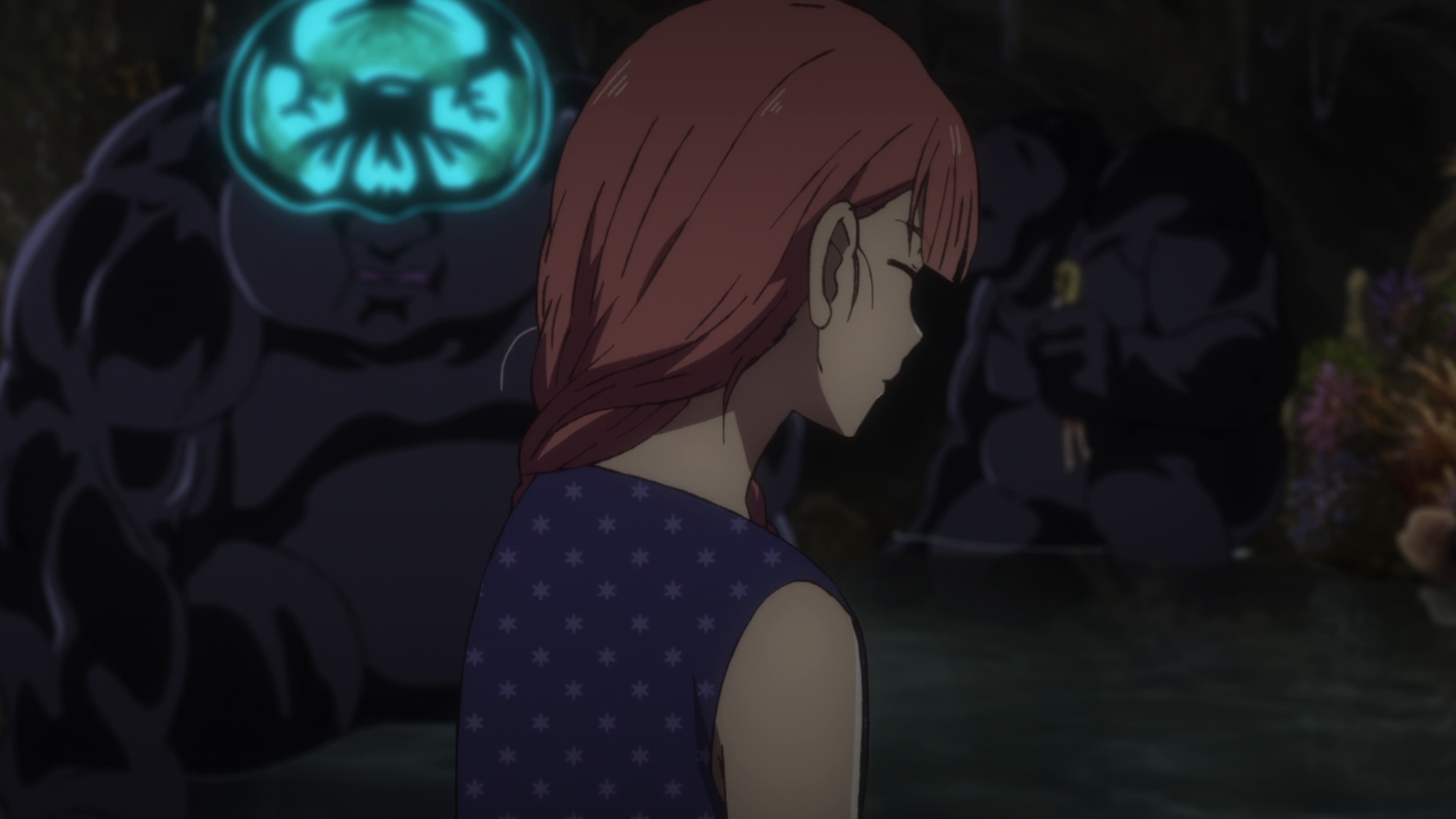 I’m really curious how long these Shadows have been around and just how strong they are to have had this whole cave (“Hiruko Cave”) as their home, and for them to basically copy parts of the ocean. From Nezu’s story, it could be that it’s been since the Meiji era but who knows. It’s interesting however with how many of these shadow babies there are, both small and large. They even looked half complete as half of of their heads are formed. How long does it take for them to fully form and to be able to be able to copy like all the Shadows we’ve seen? And how they even come to be in the first place. I also felt like there was a bit of foreshadowing when it came to “eating”. First of all, 9pm being the time to eat seems really specific for me and I wonder if it had been 9pm when the massacre at the festival happened. Anyway, Ushio had mentioned she needed the human Ushio’s original body to be able to copy and fully heal herself. Shinpei questioning if that was the only way, maybe not. The officer from last episode that went up to both Tokiko and Mio is now dead and looks like he’s going to be the next meal. It’s basically the same as what happened at the festival, but we know that Ushio would never want to do that to an innocent person. And so it makes me think…