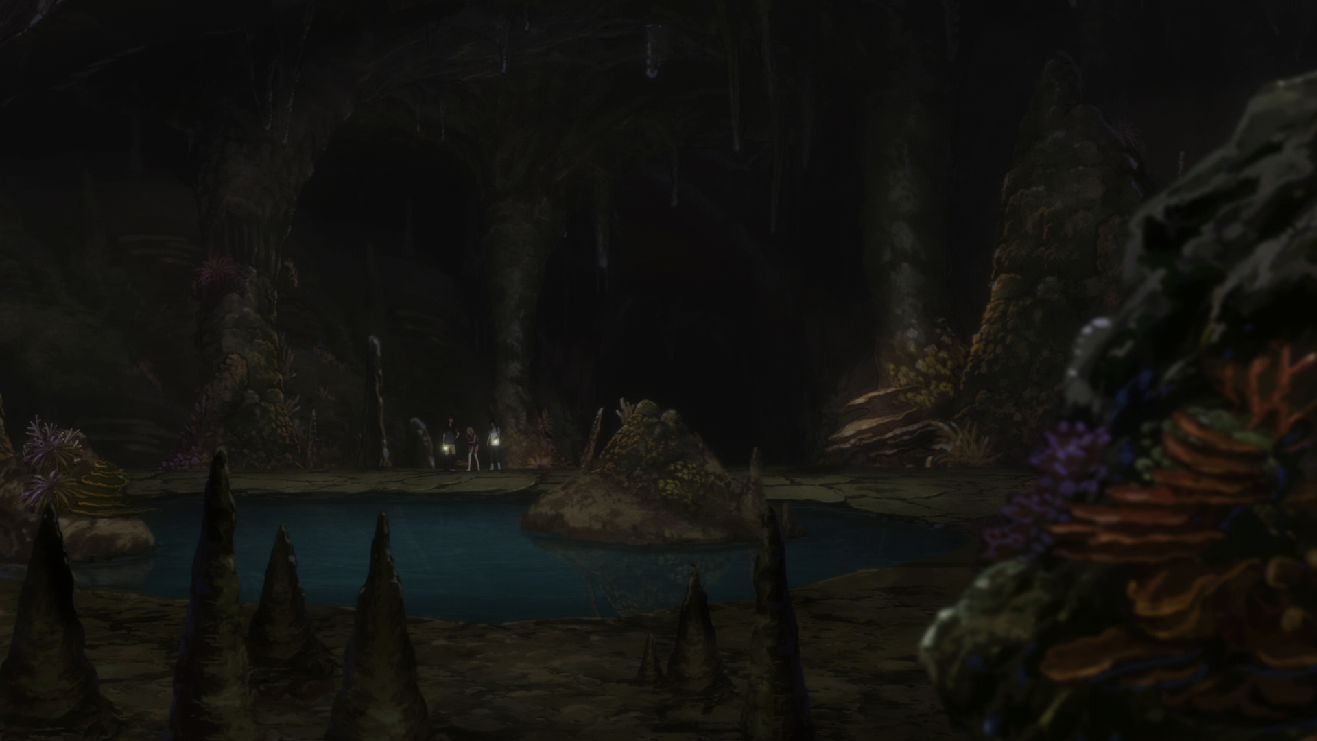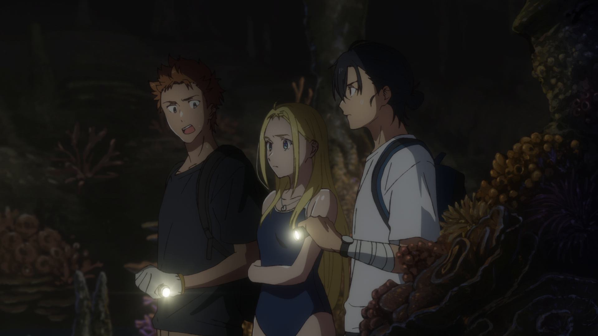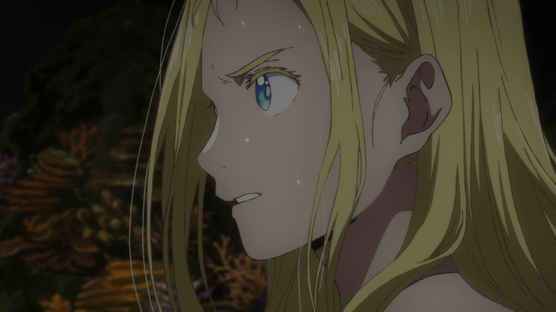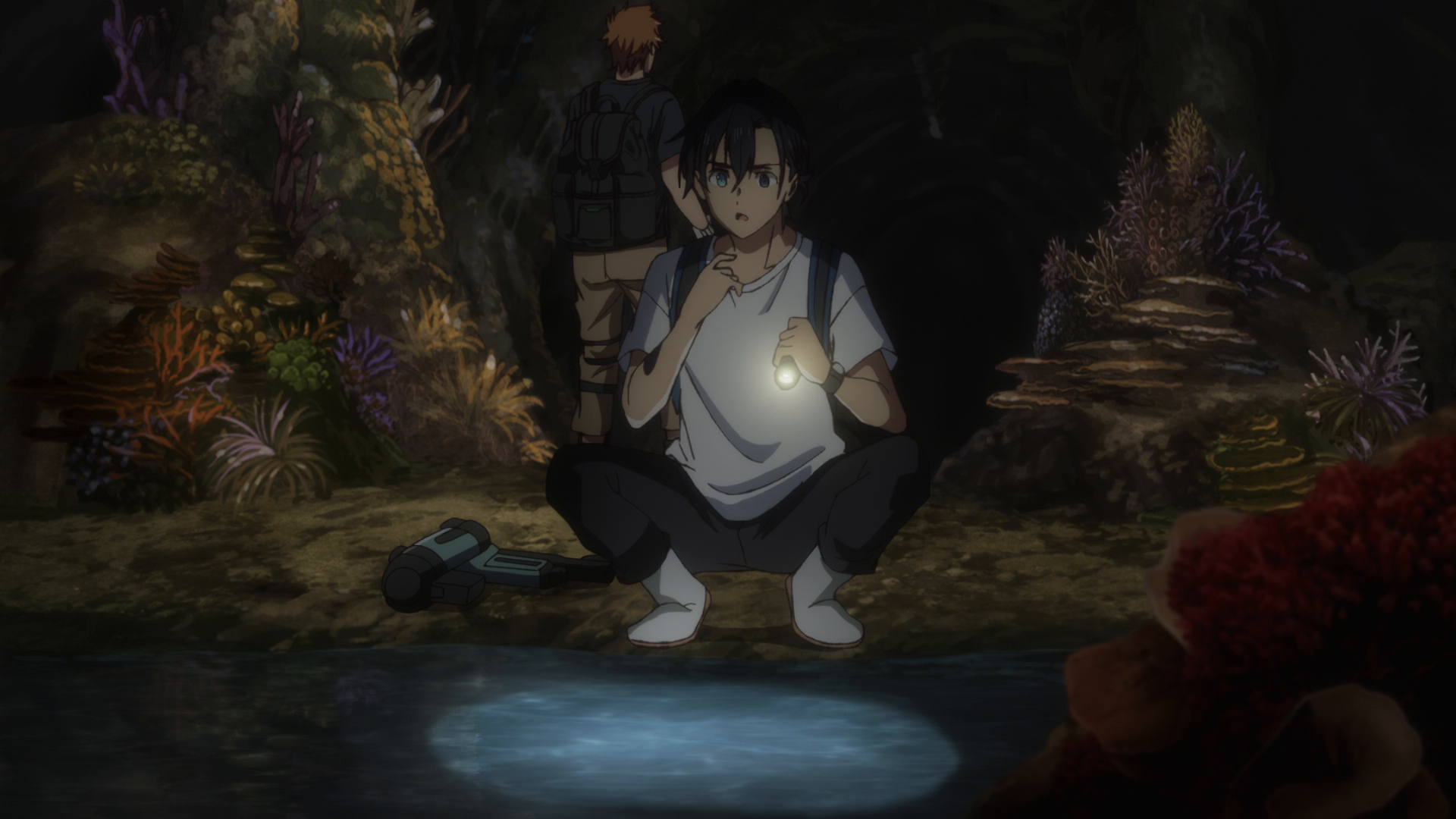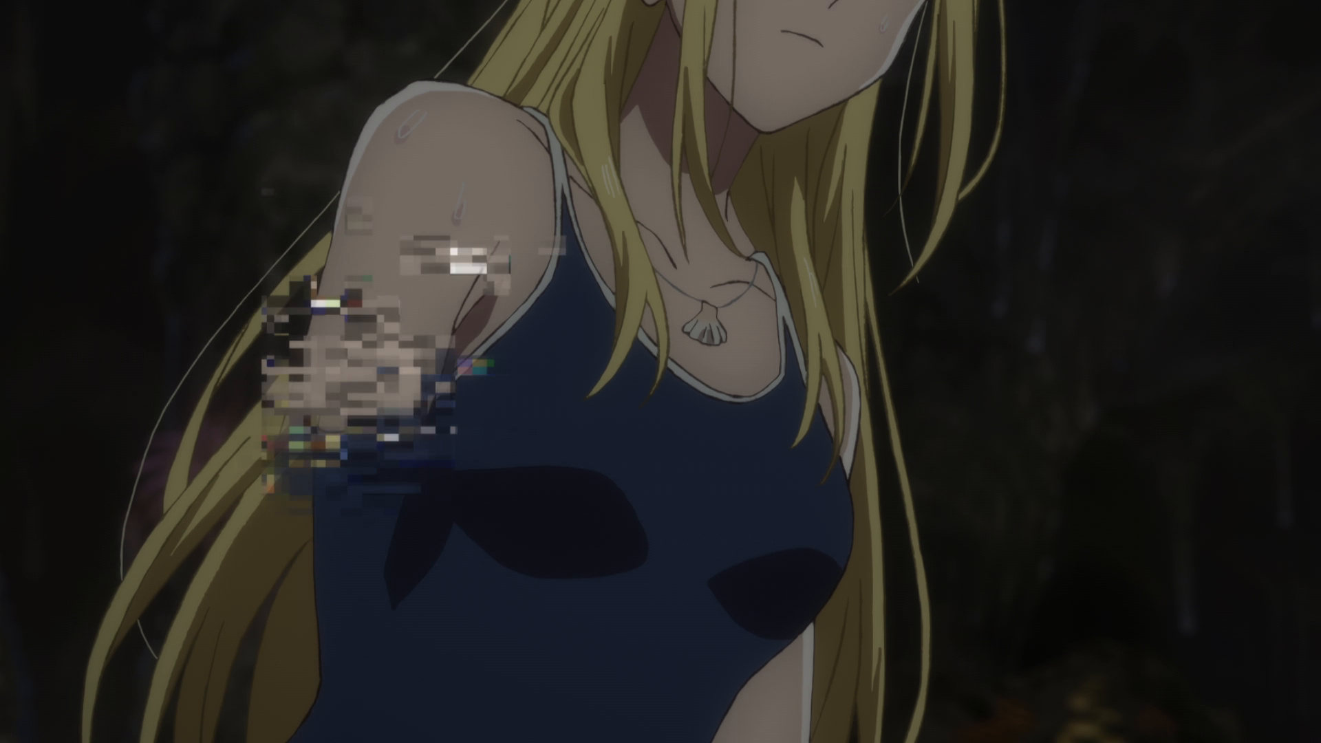 I’m really curious how long these Shadows have been around and just how strong they are to have had this whole cave (“Hiruko Cave”) as their home, and for them to basically copy parts of the ocean. From Nezu’s story, it could be that it’s been since the Meiji era but who knows. It’s interesting however with how many of these shadow babies there are, both small and large. They even looked half complete as half of of their heads are formed. How long does it take for them to fully form and to be able to be able to copy like all the Shadows we’ve seen? And how they even come to be in the first place. I also felt like there was a bit of foreshadowing when it came to “eating”. First of all, 9pm being the time to eat seems really specific for me and I wonder if it had been 9pm when the massacre at the festival happened. Anyway, Ushio had mentioned she needed the human Ushio’s original body to be able to copy and fully heal herself. Shinpei questioning if that was the only way, maybe not. The officer from last episode that went up to both Tokiko and Mio is now dead and looks like he’s going to be the next meal. It’s basically the same as what happened at the festival, but we know that Ushio would never want to do that to an innocent person. And so it makes me think…