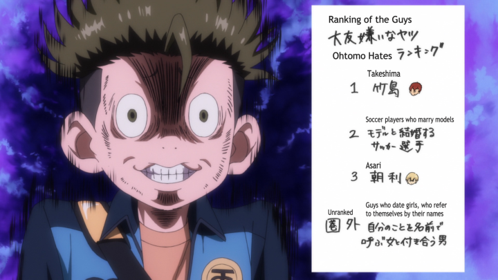 So, once the game is done, Aoi is left to sulk on a bench but receives some helpful hints from Takeshima. And as a side note, I find it hilarious how quickly Takeshima went to the top of Ohtomo’s ranking of guys he hates. Shout out to Jun for still being in the top three though. But, Takeshima talks to Aoi about his vision and just how Aoi looked from the back field position while he was still playing forward. Aoi’s ability is a mystery to everyone, even Aoi, but I like that someone directly calls him out on his lack of self-awareness. If Aoi could understand what is going on in the moments he makes the incredible plays, well that would certainly be to the teams advantage! And then of course there is the mention of Kuribayashi again. Another person suggests to Aoi that there is something that Aoi should work into his playstyle. Does Aoi know what it is? Not really. But! I really am looking forward to when the two of them are able to chat one on one and maybe swap strategies.