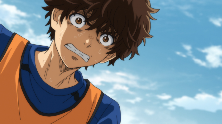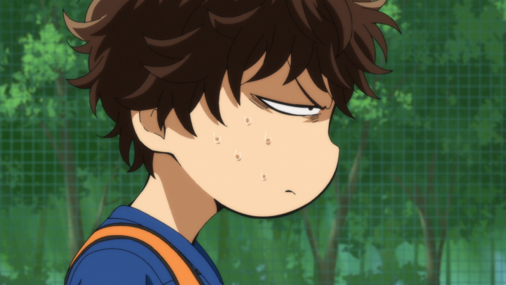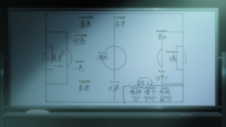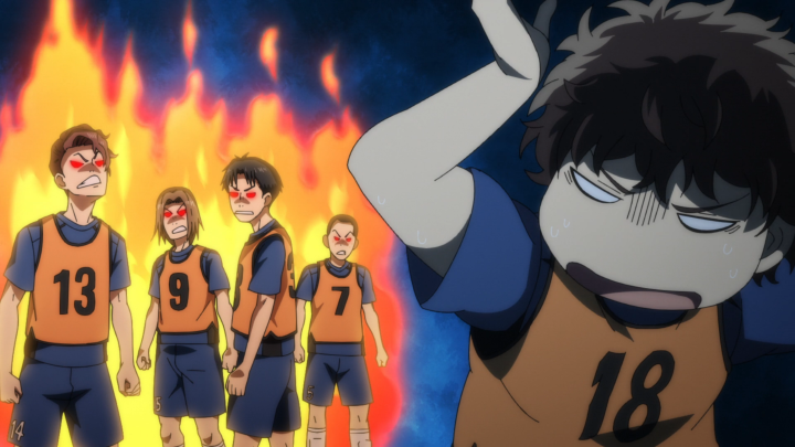 This week Aoi takes Takeshima and Anri’s suggestion to incorporate some part of Kuribayashi’s play style into his own. After studying the videos Coach Nozomi provides, Aoi is able to recognize that Kuribayashi is continually moving his head and looking around. And surprisingly! He picked up on the thing that (at least) Anri suggested! The biggest downside is that he doesn’t really understand the point of looking around. So, he spends the first practice match of this episode frantically spinning his head around as if he’s trying to find a bug that’s just flying around him. He’s not keeping his eyes on the ball or the individuals with the ball which in turn makes it very easy for him to lose the ball and for everyone to just push past him. And there are a few people on the team that recognize what he is trying to do… but the rest of the team? Well, it makes sense as to why they would be mad at him. But with all of this, Aoi does not earn himself a spot as a starter or on the bench.