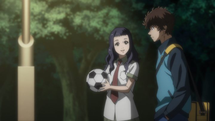 Now if this was only a couple of episodes ago, I fully would have expected Aoi to throw a huge fit over this decision. Good for him for having some character development, or rather good for him for recognizing that in his current state he’s not ready to be on the field yet. And, as he mentioned to Tachibana, there is a lot for him to learn on the sidelines. Instead he decides to sulk off on a bench and eventually asks Anri, who approaches him first, for some advice. Anri, wanting to become a future manager of a team is super excited for the opportunity so she gives him a familiar drill. But rather than just juggling the ball, she distinctly tells him to spot something when he’s looking around. It’s easy to just move your head and do the motion, but by spotting a petal, a leaf, a pebble etc it starts to train your eyes to look for something. Is that going to be a smooth transition to the field? Honestly, I don’t know but I’m glad that someone is able to break things down a little bit more for him.
