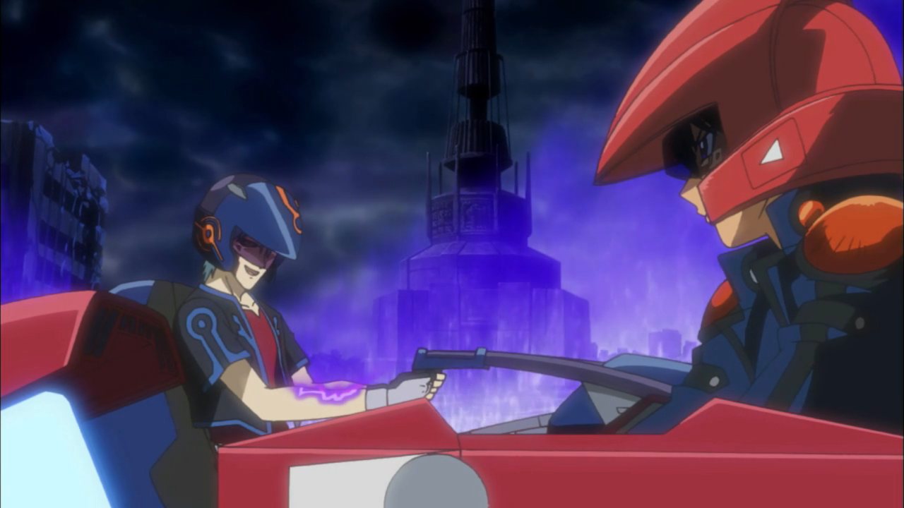 Meanwhile, we have Yusei, Jack and Crow all ready to move onto something else and head their separate ways. Ultimately, the catalyst to the beginning of the disbandment was when Kiryuu went off the rails, exhibiting much of the ruthless and cruel behavior much like how he is now as a Dark Signer. Eventually it got to a point where Crow was the first to snap, and his departure was imeaditely followed by Jack. Yusei decided to stay by Kiryuu’s side, but his last straw was when Kiryuu suggested they fight the Security as ‘Team Satisfaction Final Opponent’. It was a suicide mission he did not want to be a part of, and left the team hoping that his departure would dissuade Kiryuu from pursuing it. Unfortunately for him, Kiryuu has evolved into a full blown maniac who decided to provoke Security into fighting him by bombing their headquarters.