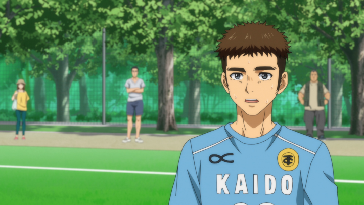 Overall, this episode was pretty steady especially in Aoi’s growth. I liked that things were able to click for him, but also that he still struggled. Previously when he figured out the triangle, he became unstoppable with Asari and Kuroda and things seemed to settle into place pretty darn quickly. But this time around, he has some hits and misses because he is still exploring what it is like to be on defense. Slowly, he starts to see the openings, but initially, he falls into his bad habits and tries to take care of it all on his own which leaves many openings behind him. But after having his chat with Nozomi, he slowly starts to realize that he can make use of the other players around him. Aoi, being on the back line has the full view of the field. He can see things that others may not and so by giving directions he’s able to plug up the other team’s openings. And he’s still very new to this, so it does take a more experienced player to jump into the fray and that player happens to be Yoshitsune.