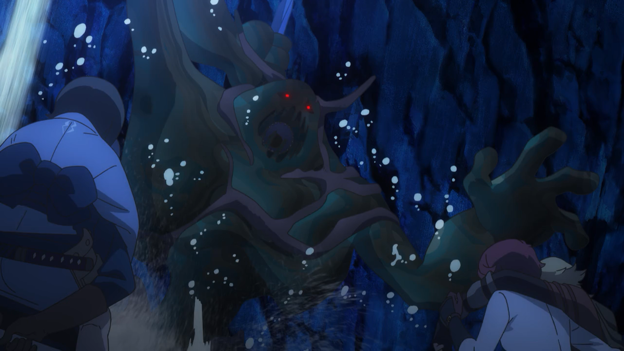 And after last week’s endless warnings of why they need to stay away from the water, it was certainly only expected that it was Bell to be the one to be separated from the party. He did actually get a really good hit on it with his Fireball attack, as Moss Huge really didn’t like that (go figure). But frankly the moment Bell was pulled into the water, I was more afraid the thing was going to snap the stone off and impale Bell with it since the opportunity to do that was certainly there. But as mentioned in the above, the monster knows who to pick its battles with, and in that moment, it certainly decided it was better off to strategically hope that Bell would fall to death or drown. In any case, even if neither happened, he still had to survive being on the lower levels on his own, which he quickly found himself in a real pinch when he came face to face with a swam of Inguazu. Lovely!