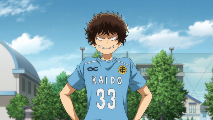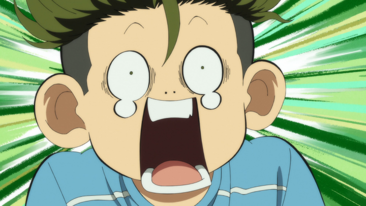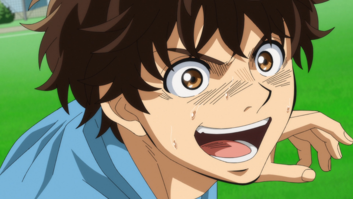 Is it bad to say that I’m glad that Ishikki got injured? Strictly in the sense that it helped to prevent Aoi from falling into a rut? With the injury Nozomi was able to make a change to the team’s system which allowed Aoi to experience both offense and defense at the same time. Of course as an outside viewer, I get why we wanted to place Aoi in the back, but that’s not something that Aoi has been able to fully understand. Now that he’s closer to the center he can practice both and see how they work in tandem. Many games ago, Aoi would have just been shouting for people to give him the ball and trying to score all by himself, but now he’s getting much more comfortable using the rest of his team to support what he is trying to do. Quickly, he’s able to implement the triangle with Yoshitsune and Ohtomo which allows them to successfully make it all the way down the field. Unfortunately, that doesn’t quite get them the score, but when the ball comes flying back to him (where he is much further back) he is able to come up with 4 possible solutions (well, technically he only shared three, but he mentioned 4). First, he could score for his own, kick the ball slightly to the right and take a clear shot. But, that likely leads to a lot of time for the goalie to prevent the goal from coming back since it is coming from such a distance. Second, there’s the opportunity to send it over to Tachibana. Unfortunately, Tachibana is still in his slump which leaves a lot in the air as to if the maneuver would be successful. And finally, we have getting the ball to Togashi who ultimately headbutts the ball into the goal. Which works! And it’s pretty cool considering that two fullbacks are able to get the goal!