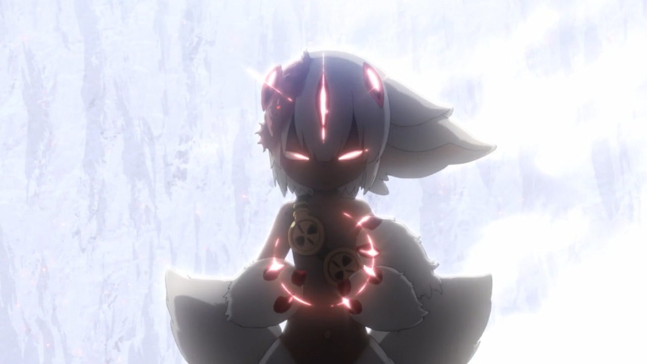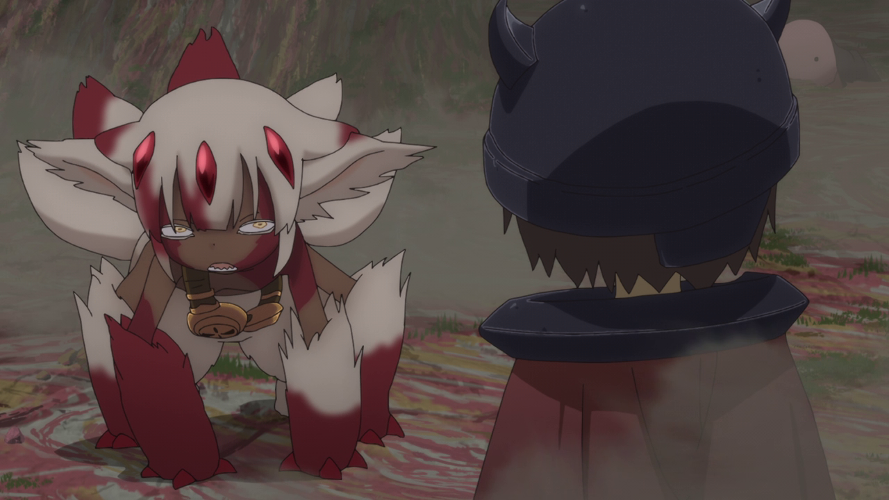 We finally see the flashbacks of how Faputa and Reg met each other, how Reg was before, their promise of Faputa wanting to destroy the village, an additional promise of them always being together and maybe creating a family of their own, and just their relationship in general and how they cared about each other. Reg was given a mission by his creator to head up to the Abyss to find a Haku (a very precious thing), to which he promised Faputa to return and fulfill her desire and they would stay together. That whole time Faputa was waiting for him, slowly sinking back to her loneliness and grief when he never did. And for him to finally come back and not remember a thing, I can understand why Faputa is so hurt. We see that they had a great friendship, and Faputa even developing feelings for him, so for all of that be suddenly be gone…I can imagine the pain that all brings. During this, we also learn the meaning of Faputa’s name (immortal princess), what Haku means and why we see that symbol. As Faputa was born from three eggs, she explains she has three Haku. One of the symbols is on Gabu, the second at the very entrance of the village for Iruumyuui. And the last one I remember being drawn on the self portraits Nanachi drew when they were going to send their letter balloon, as Faputa drew it on top of Reg. Pointing to, again, Faputa’s strong feelings for Reg. Another interesting tidbit about this, when Faputa appeared in the village the previous episode her gems and claws shone to make the Haku symbol on herself in an incredibly cool shot. Which…ohh, of course Faputa would be Iruumyuui’s Haku. Ugh, the pain doesn’t stop. ;~; We also understand all the rock structures from her little cave and why she was so happy to see Reg again. Faputa has always been a lonely girl so again I understand her sadness and irritation, but I can’t say what she’s doing is right. This village has been around for a long time and there’s plenty of Hollows in there that have nothing to do with what happened all the way back then. And even though Faputa loves Reg so much, it looks like not even he can stop her as she continues to fight and push him away. Faputa doesn’t show any mercy to Reg as she is blinded by rage, attacking him brutally and even at the very end. The music abrupttly cutting to Faputa’s words of “…but foolish, sosu.” and blacking out was chilling. VERY well done. This episode was great.