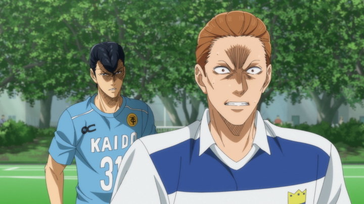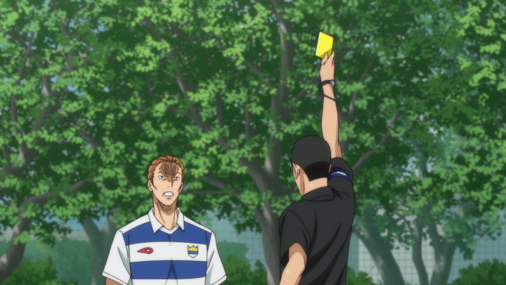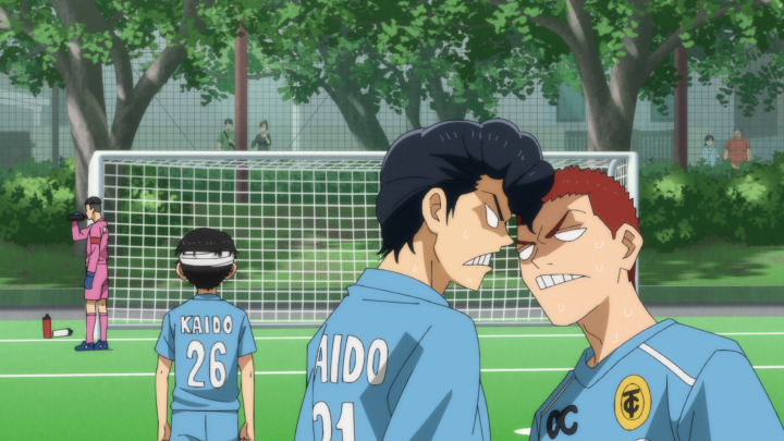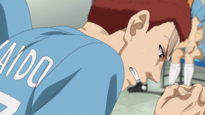 And I have to give kudos to the episode for giving us a focus on Togashi. He’s a really interesting character who genuinely loves soccer but tends to be ostracized for various reasons. Hands down my favorite part is when Togashi is reminiscing about both Fukuda and Coach Nozomi. It starts out with him being very deliberate in only caring about Fukuda’s teaching and of course, ultimately being disappointed when he’s stuck with Nozomi, who, compared to Fukuda, is practically a nobody. And that view of Nozomi really bums me out, because over the full season I’ve grown to appreciate him a whole lot more! He’s still the stone-faced coach, but he’s the stone-faced coach that cares about his players and their growth. So, when Togashi begins to recollect what Nozomi has said to him, it feels really good to see him acknowledged. And to top it off, Nozomi is likely one of the first coaches Togashi has had that encourages his play style. Togashi is just seen as a brute and racks up the yellow cards; people are scared of him. But Nozomi? He doesn’t see anything inherently wrong with it. He knows that Togashi is almost being targeted but doesn’t actively discourage it. And ultimately, it feels really nice when you have someone on your side.
