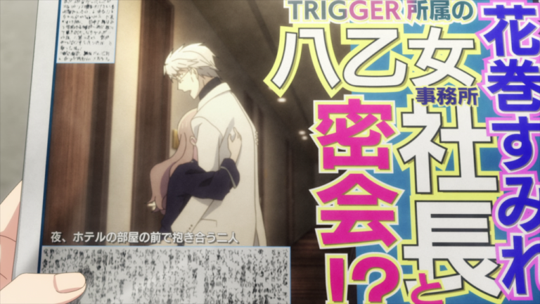 While it was smart of him to bring two female employees with him to this meeting, of course they ended up just far enough from him so that they could just cut them out of the photo when Sumire flung herself at him. Just like what they did with Nagi when he was witness to the Ryu and Sumire situation. It’s honestly disgusting how far Ryo is willing to go just to set Trigger and Yaotome Productions up. Not to mention I just CANNOT with Sumire. As I said in my last post on episode 13, I UNDERSTAND she’s going through a lot and is feeling pressured and cornered by her agency. However, that does not justify her dragging others down into the mud just to escape it. And she’s only doing this because freaking Garbage Man gave her an empty promise for marriage. Girl, have a little more self respect than that. Not to mention with how many “scandals” she’s been a part of with people from Yaotome Productions, wouldn’t it be suspicious after a while??? But of course, the public’s opinions are easily swayed by how the articles are written and with how big Tsukumo has become, it’d be difficult to speak up against them.