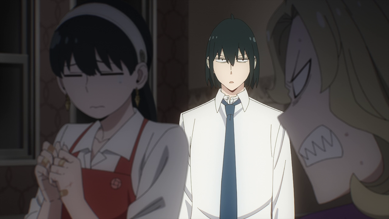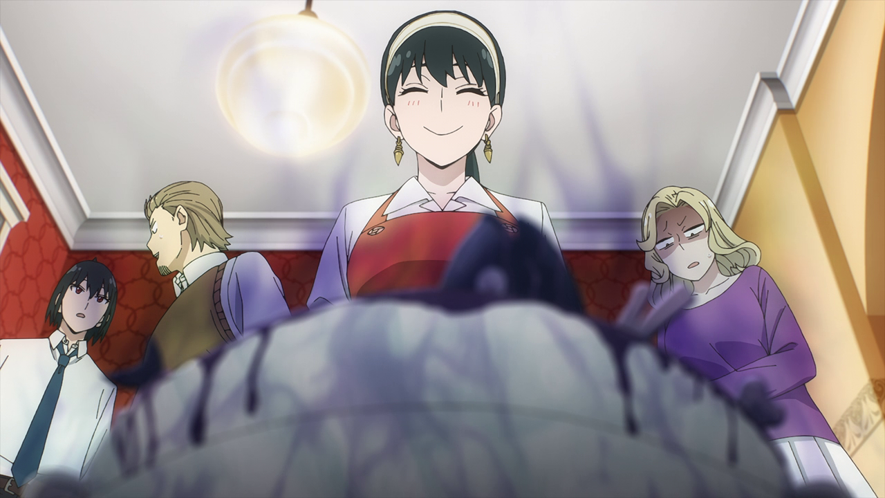 Now that we’re past the dog arc, we return to the mundane chaos this family often finds themselves in. When Yor walks in with cuts all over her hands, I think the initial expectation is that she’s taking on a very dangerous assassination job. Made even worse with the way too over the top dramatic music playing along with her statement of possibly losing Loid and Anya… Only for it to be about Yor trying to learn how to cook.