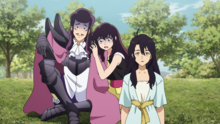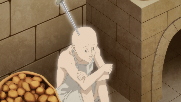 But enough about Fushi. Let’s talk about Bonchien Nicoli La Tasty Peach Uralis. A lot of pieces come into place in this second half of the episode – how does he know where Fushi is? What is his relationship with Tonari? Why does he talk to people who aren’t actually there? Well… he has special eyes. In this episode they mention that he can also see the future (but we really don’t see a whole lot of that so I won’t talk about that for now). Bon can see and communicate with dead people, something that he really wasn’t all too familiar with when he was young. Like a lot of other characters with special powers, they don’t know they are different because this is something they’ve seen for their whole life. In fact, his mom actually tries to exorcize him due to his odd behavior. I don’t know about you, but if my parent hired someone to tie me to the bed, cut my arm and let me bleed all night long… I’d be pretty affected by that. I’m surprised Bon doesn’t have more resentment towards his parents. But back to the spirit thing – Of the people he can see regularly, one is a kitchen dweller with a sword in his head, Fen, and the other a swordmaster with a missing arm, Nixon. Bon refers to them as his closest friends, primarily because they’ve been around him the longest. The only one he feels closer to is a storyteller who would visit him at night. And let me tell you when they revealed it to be Tonari? I lost my mind. I am so happy that we get to see her again! I can’t wait to see how this connection ultimately impacts Fushi and Bon’s relationship.