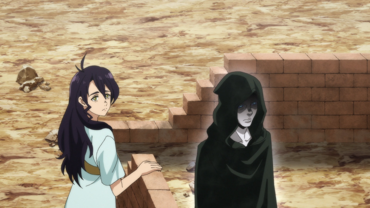 Since the episode was broken up into two parts, I’ll talk about it in two parts. So starting off we have Fushi’s preparation for departure. This part of the episode truly felt as slice-of-lifey as I think this anime can get. For the most part, characters are just going about their life and having miscellaneous conversations with one another. Even though there is a looming threat of Nokkers, there isn’t necessarily a grand panic among the cast. Instead, we are going to let Fushi leave the kingdom of Uralis, but this time Bon (and some additional travelers) will be coming with them. We have short and cute humorous moments, such as Fushi trying to build his outside home one brick at a time (only to stop and put a tarp over it) and Fushi trying to bond with a horse (unsuccessful). Bon gives him the tasks of learning how to smile, making friends, or making a lover, which slowly starts the conversation about Fushi trying to learn more about love. This was hinted at earlier with Hisame, but more so in the fact that he doesn’t really know what it all entails. Has Fushi experienced love? Yeah! I would argue that he has, but does he understand and recognize it? No… I’m really looking forward to him having this realization.