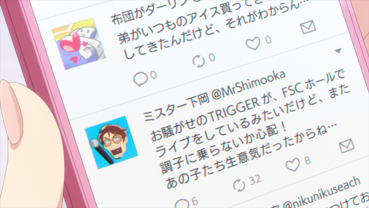 And yes, Re:vale are kings and always have been—it’s so sad some of the side stories and happenstances in the chats won’t ever get animated. Yuki and Momo won’t back away from the confrontation, even if they didn’t go looking for it in the first place. The “Yes,-this-is-Trigger-and-so-you-don’t-doubt-it, we-even-got-the-spotlight-to-shine-the-proper-colors” moment was awesome! And complete with challenge using hand-gun gesture to boot!