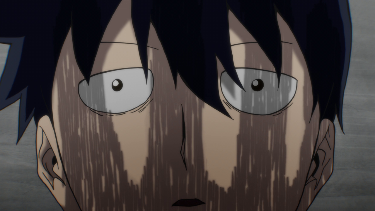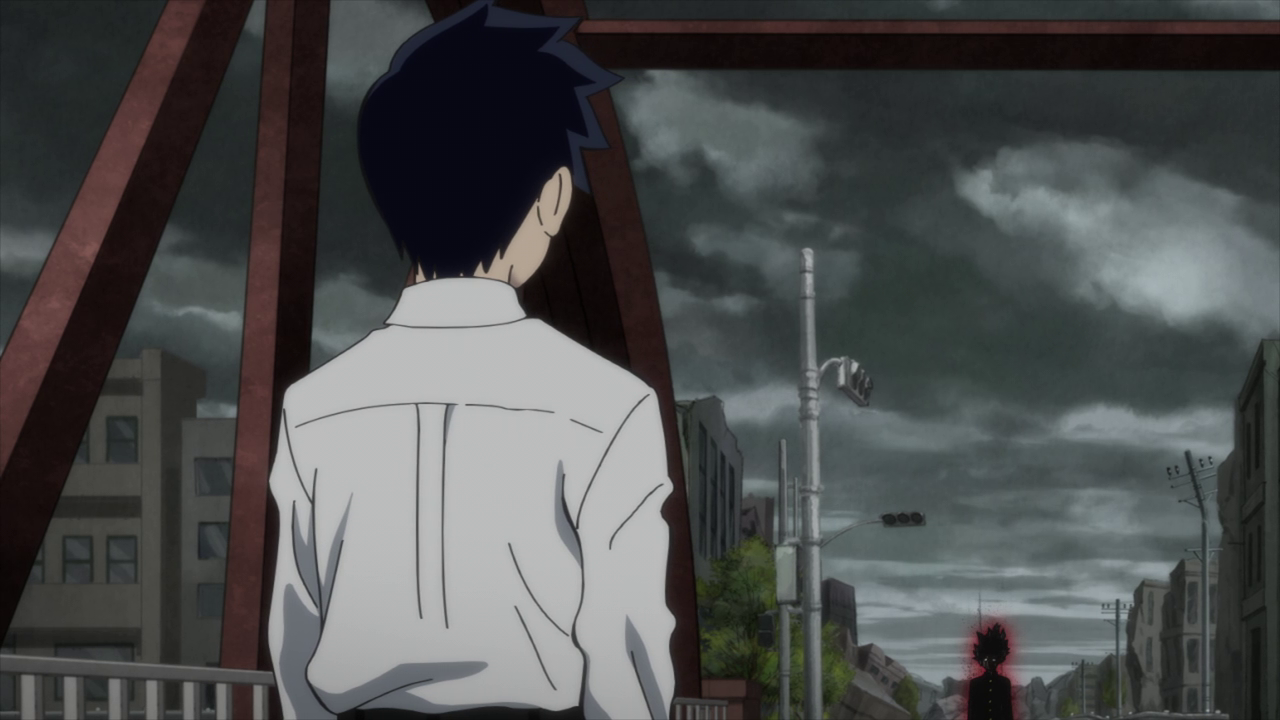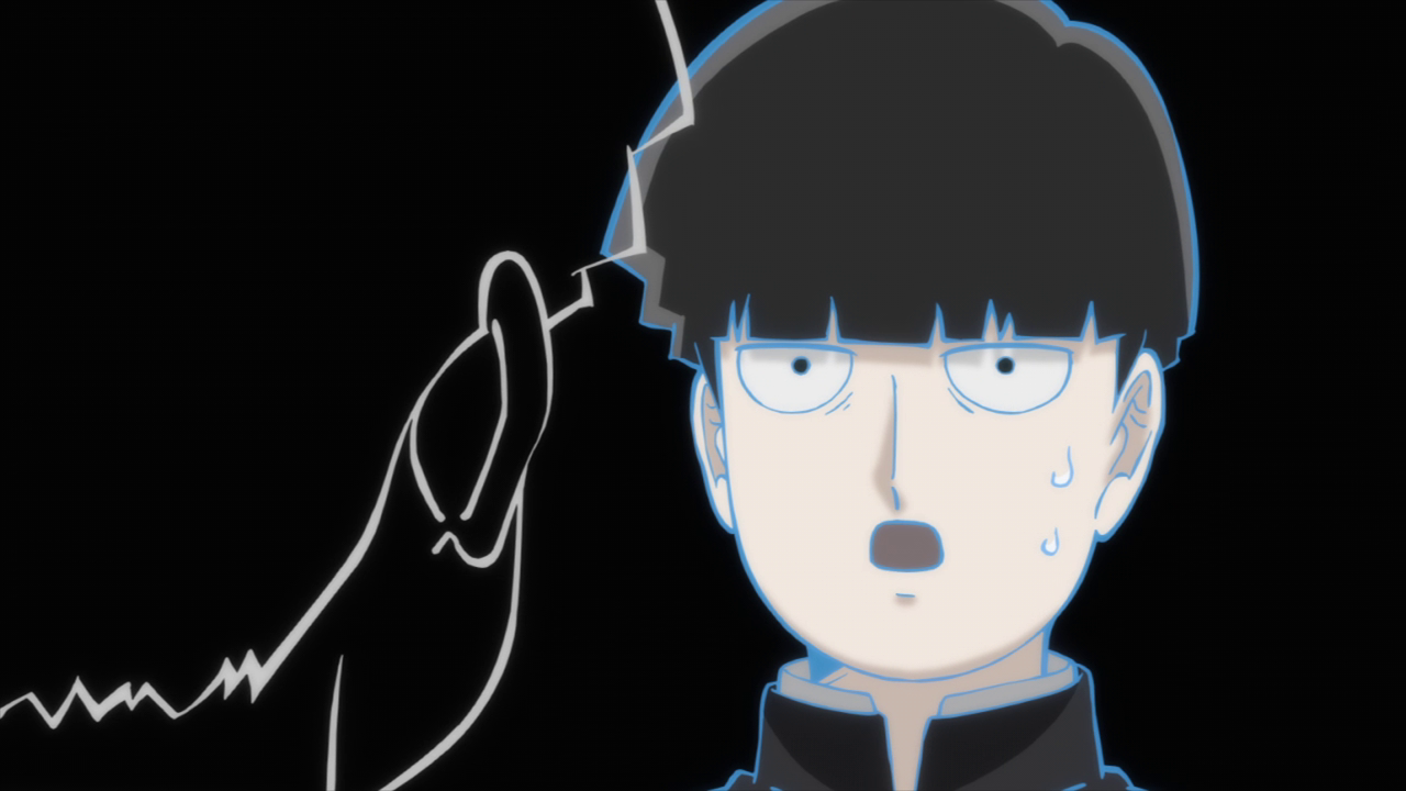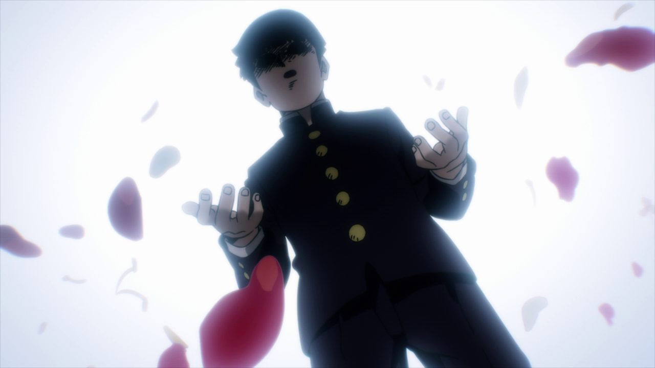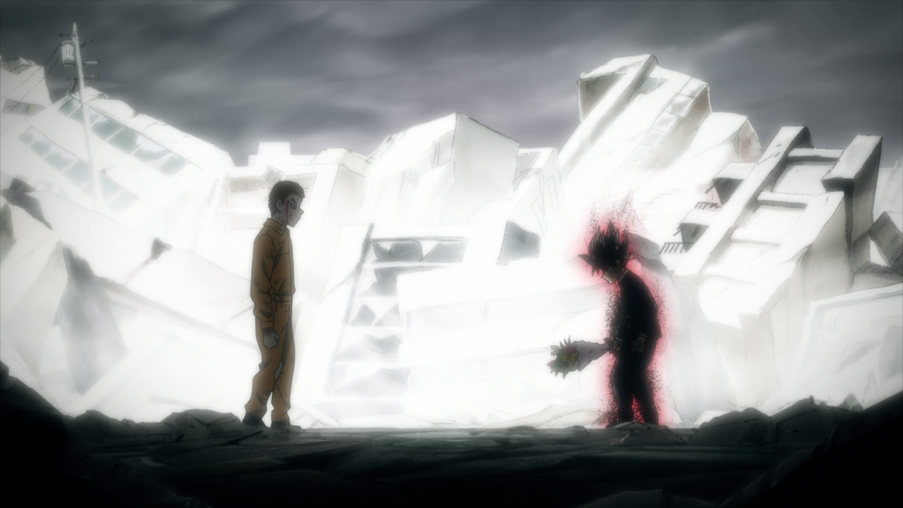 Despite the dangers of ???, Ritsu still acknowledges it a part of Mob that can’t be separated and something they all have to live with. Though it’s still a little confusing on what exactly ??? is since Ritsu sees it as a part of Mob while Mob himself views it as a completely different entity. The way that ??? presents itself in Mob’s consciousness seems similar to a Shadow from the Persona series, believing itself to be “Shigeo Kageyama” and Mob as the “fake” all the while wanting to live freely as it pleases. Not to mention it’s something that Mob suppresses and tries to keep hidden, just like a Persona Shadow. But despite it viewing itself as an individual, it still abides by Mob’s strongest feelings, which was to see Tsubome. And they certainly cranked the creepiness factor up a few notches with Mob starting to crack and fall apart while the pieces fly off and attach itself to ???’s outline of Mob. I do hope they clarify just what exactly ??? is in the next episode because I am both intrigued and confused by it lol. I do really like how ??? is portrayed as a transparent outline of Mob that starts to gain shape with every piece that is broken off of him even if the fact of it taking Mob’s place is terrifying.