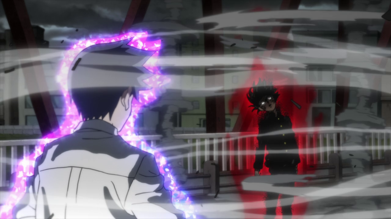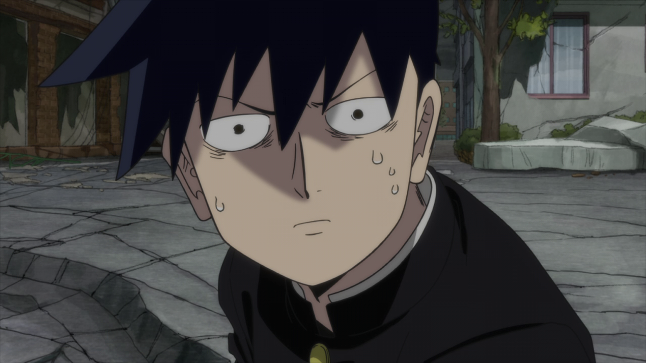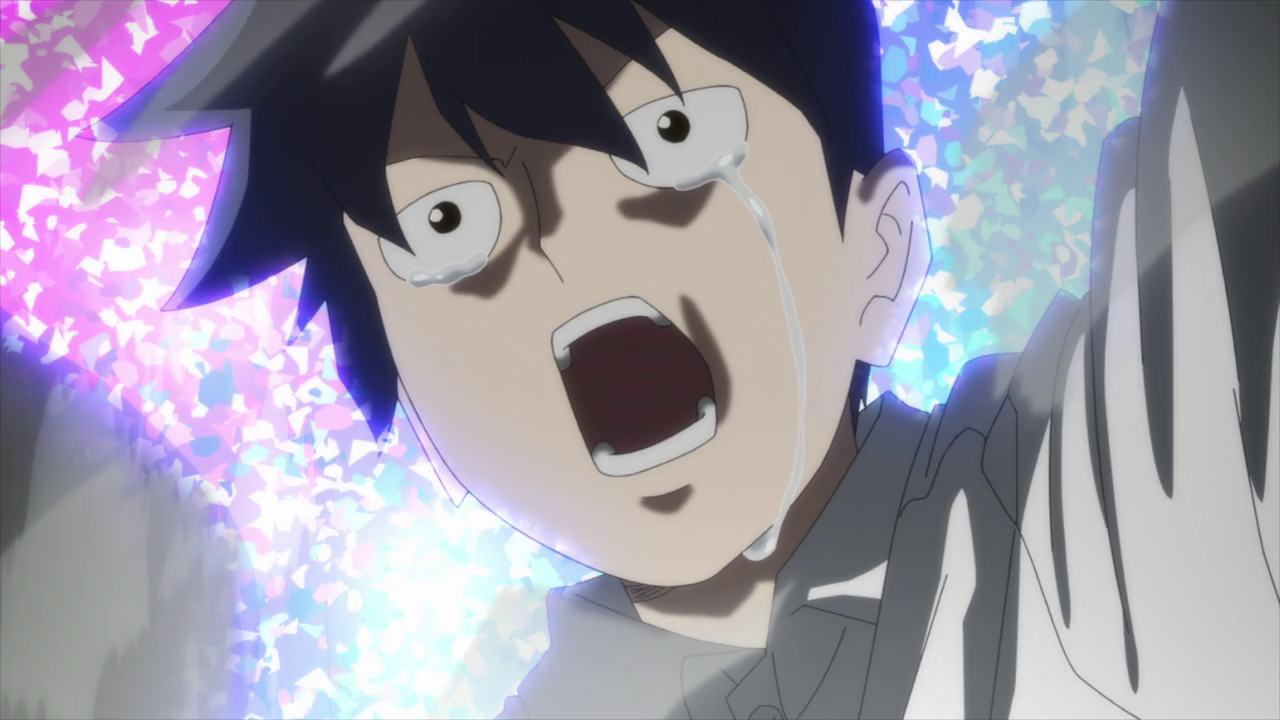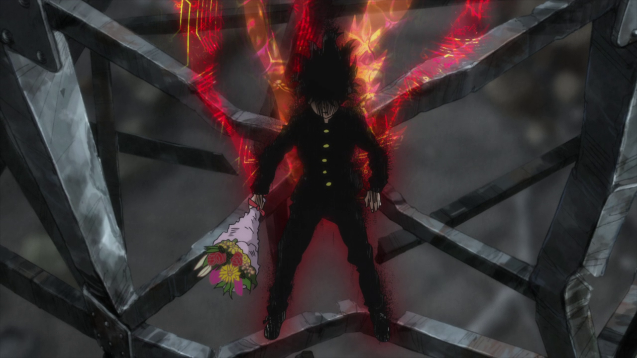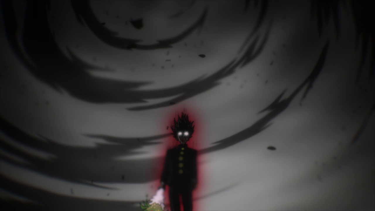 The biggest contrast to Ritsu and Mob’s relationship in Season 1 and now is that Ritsu is willing to be there for Mob rather than just putting on a front out of fear. Ritsu wants to be someone Mob can rely on when he needs help and doesn’t want him to continue suffering in silence. He wants Mob to be released from the trauma just as he has. And boy did I feel myself tearing up a little when Ritsu went 100% for the first time all the while crying that he is someone he can be someone Mob can speak his mind with. He realizes that the reason he wanted powers was to be on the same level as Mob, to be his equal so that Mob wouldn’t have to hold back on speaking his mind to him and being someone who could stop him if he went out of control. Sadly, despite being at 100%, there was really only so much Ritsu could do to hold ??? back and ended up being blown away. Thankfully it doesn’t seem as if he was hurt too bad from the fall and for all I know ??? might have gone a bit easier on him due to Mob’s powerful feelings towards his brother. Especially since Ritsu was the only one who didn’t end up getting knocked out or beaten down so much that he didn’t have the strength to continue.