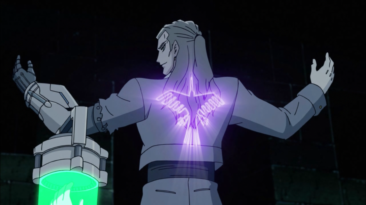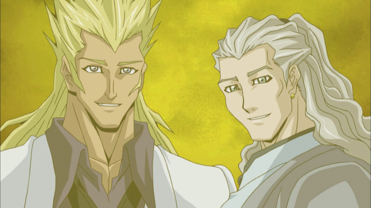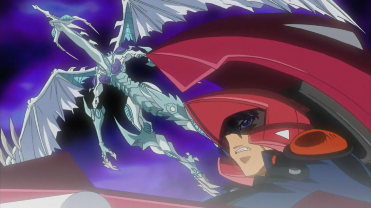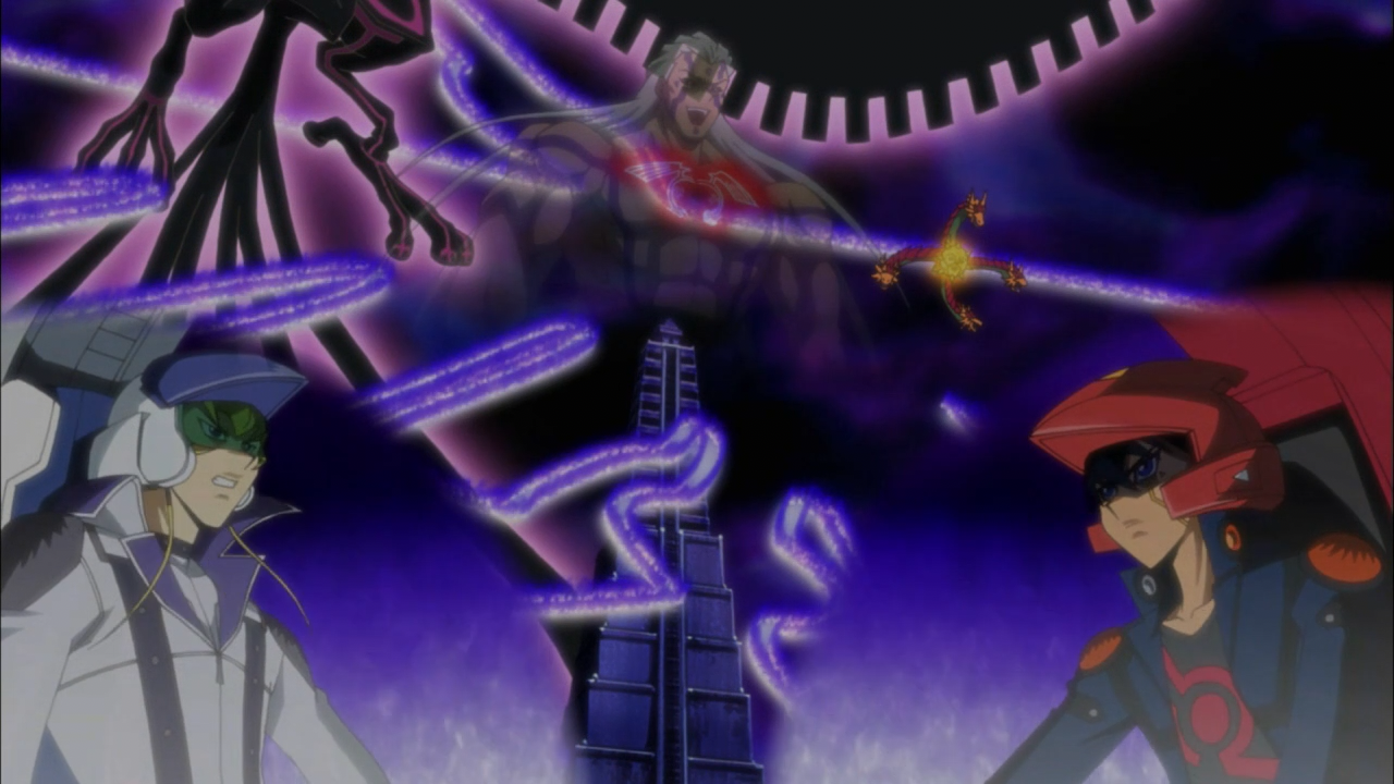 Then there was the backstory of what had actually happened to Rudger, and it turned out to be pretty messed up. His body ended up being chosen to serve as a “battleground” for the fight between the Dark Signers and The Crimson Dragon’s Signer. So it’s no wonder he got all twisted and messed up, unfortunately the Dark Signer was winning the internal battle, and unleash the catastrophe of Zero Reverse. He had chopped of his arm that possessed the mark of the Crimson Dragon, and entrusted it to Rex (Godwin) in hopes that they could find a way to defy their destiny and break the cycle. Anyhow, turns out the whole chopping off his arm thing didn’t really work out anyways because there was one problem: Godwin had other plans. When he went to visit him, he purposely lost to him in a duel, revealing he had this belief in his head that because his brother wouldn’t be able to defeat Yusei, the only way to change destiny is to become a God himself, and that’s how we got this crazy arrangement with Godwin possessing both the mark of the Dark Signer and Crimson Dragon.