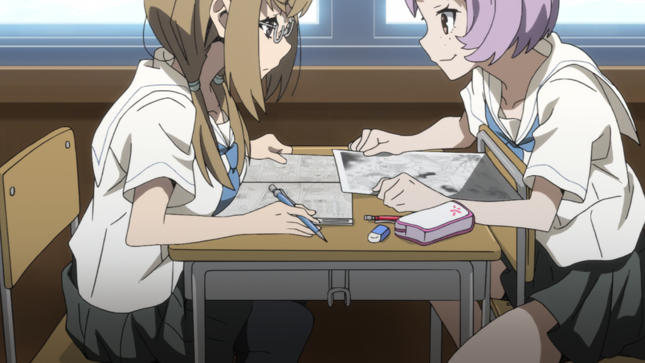 I think it’s also interesting to note how uncomfortable “perverted” things makes Honoka. It could even be seen back in episode 3 where Hisomu… “came”, she immediately put her hands up so she wouldn’t have to look at it. And when Ruru brought up how those kinds of scenes would make the manga more exciting, Honoka didn’t want to draw those type of things. I’m not sure if it’s that important, but considering it’s been brought up a couple times, I’d like to think that they were trying to make a point with it.