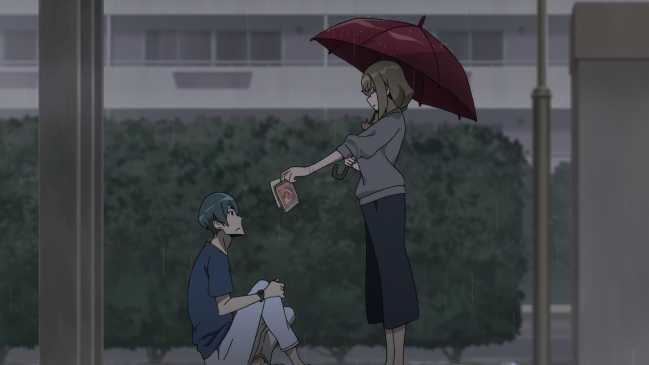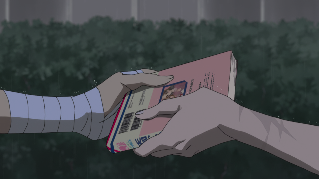 I also want to bring to attention that whenever the two are conversing one on one, there is always SOMETHING in frame that is vertically placed between them to represent separation. And during the earlier scenes with them, Yuta is always shown to be the closest to the dividing line while Honoka is the furthest away from it. He obviously wants to be closer to her, but he was being much too pushy about it in the beginning and Honoka literally wanted nothing to do with him and had her guard up. Even in this episode, Yuta is boxed off from that little overhang thing while waiting for Honoka. However, unlike the other times, this time Honoka came over to the dividing line first. And I love how when Yuta comes over, he doesn’t actually pass the dividing line between them and only reaches over to pass the manga over to her. The symbolism of their relationship through out this series is just fantastic.