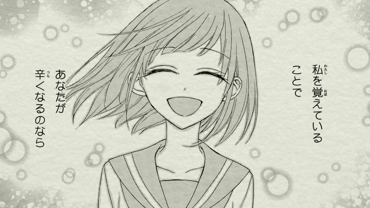 We finally get to learn the extent of Honoka and Ruru’s relationship and how it seemed that they were both each others’ first friends. Which is honestly really sad in hindsight at how old they were. It was honestly really cute how Honoka was the one who could write interesting stories while Ruru was the one with the artistic talent. They were able to cover for each other’s weaknesses and were able to make their manga a success because of it. And seeing Honoka so happy in her friendship just hit me in the feels looking at her currently. It’s honestly sad how things ended up between them. Though I will admit, I really don’t like how forceful Ruru comes across and how she will use her sickness to get a reaction from Honoka. Especially since it made Honoka really uncomfortable. Not only that, Ruru really didn’t take Honoka’s feelings into consideration and only thought of herself. Which could contribute to her having an incurable disease, but it still doesn’t make it right. While I do think it was wrong of Honoka’s to just up and leave Ruru to finish the last chapter on her own, I can understand why she did it. It’s hard to be around someone you know is dying. And in Honoka’s case, after that near kiss they shared, she got scared. Especially since if she let her feelings flourish, she would only end up getting hurt even more from losing her.