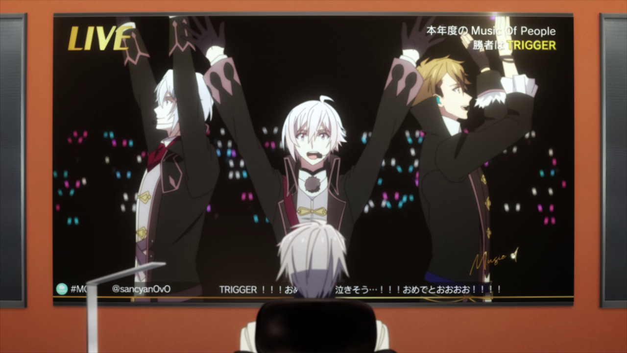 It’s really too bad this episode was rushed, which is unfortunate because as a whole, they absolutely killed it this season! But I’m not really sure if it would have helped or not to have one more episode to maybe pace things out a bit better, but we’re lucky enough as it is have even gotten thirty episodes this season. I think it mostly just has to do with how this season ended in general. The outcome of MOP was kind of predictable, and if I may be so frank: even a bit boring with it only being between Trigger and Idolish7 again (RIP the Hearty Wings band that filled in for Re:Vale and ZOOL that wasn’t even mentioned among the announcements. Honestly I don’t know why they even bothered to include them in the shot for the announcements). The results were as expected because I honestly didn’t think Idolish7 would win again after their previous wins (JIMA and Black and White), and not to mention, it was important to show how Trigger’s unwavering focus of their end goal helped them weather through the storm. That said, they still managed to hit me in the feels when Tenn let out that breath he had been holding in anticipation of the results. He put on a confident face, but he was just as nervous as the rest of them!