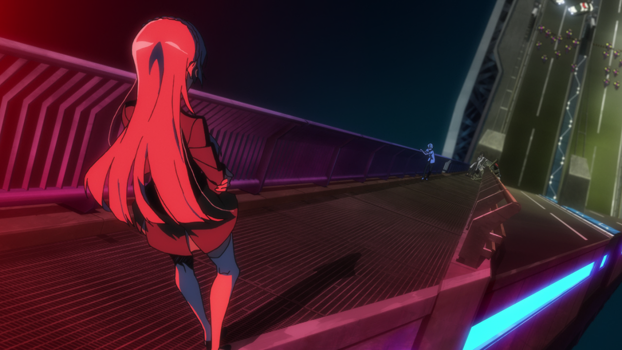 Katsuhira confronts Sonozaki while hanging onto the side of the bridge after an unnecessarily dramatic car scene. But BOY was the shot of Katsuhira looking up at Sonozaki while red light shone behind her just makes for a great shot while also just having a lot of different meanings. It reflects the beginning of the series with the brief flashback of little Katsuhira looking up at Sonozaki as she stands at a precariously high place. Not only that, but to Katsuhira, Sonozaki was always someone he just couldn’t wrap his head around and she was always far beyond his reach in a metaphorical and literal sense. While I don’t care for this ship, the framing of this shot is just too good to ignore.