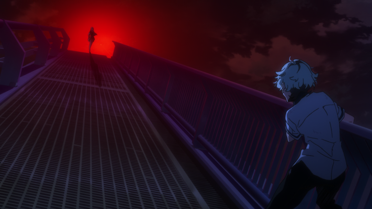 Katsuhira confronts Sonozaki while hanging onto the side of the bridge after an unnecessarily dramatic car scene. But BOY was the shot of Katsuhira looking up at Sonozaki while red light shone behind her just makes for a great shot while also just having a lot of different meanings. It reflects the beginning of the series with the brief flashback of little Katsuhira looking up at Sonozaki as she stands at a precariously high place. Not only that, but to Katsuhira, Sonozaki was always someone he just couldn’t wrap his head around and she was always far beyond his reach in a metaphorical and literal sense. While I don’t care for this ship, the framing of this shot is just too good to ignore.