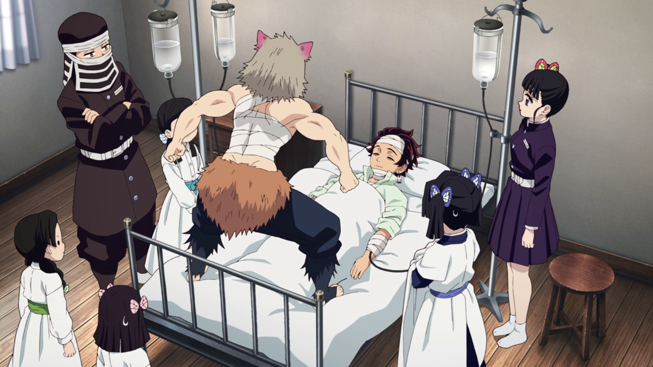 Dude, I was SHOCKED that Tanjiro was out for TWO FREAKING MONTHS. Considering how beat up he got from the Entertainment District Arc, it’s honestly no wonder. I just wasn’t expecting him to be out for that long. And while I love Demon Slayer, I do admit that the pacing and comedy can be a bit weird at times. Especially with how serious the situation was with the Upper Demon meeting and then switching to everyone screaming in Tanjiro’s room. Though I do admit I did laugh at Aoi frantically running into the room caught up in the sheets she was hanging after hearing that Tanjiro woke up and how Inosuke was just hanging on the ceiling above him waiting for him to wake up. Talk about emotional whiplash, but I feel like it’s to be expected at this point. Though still not as bad as what I experienced from watching Fire Force.