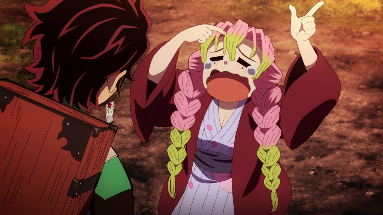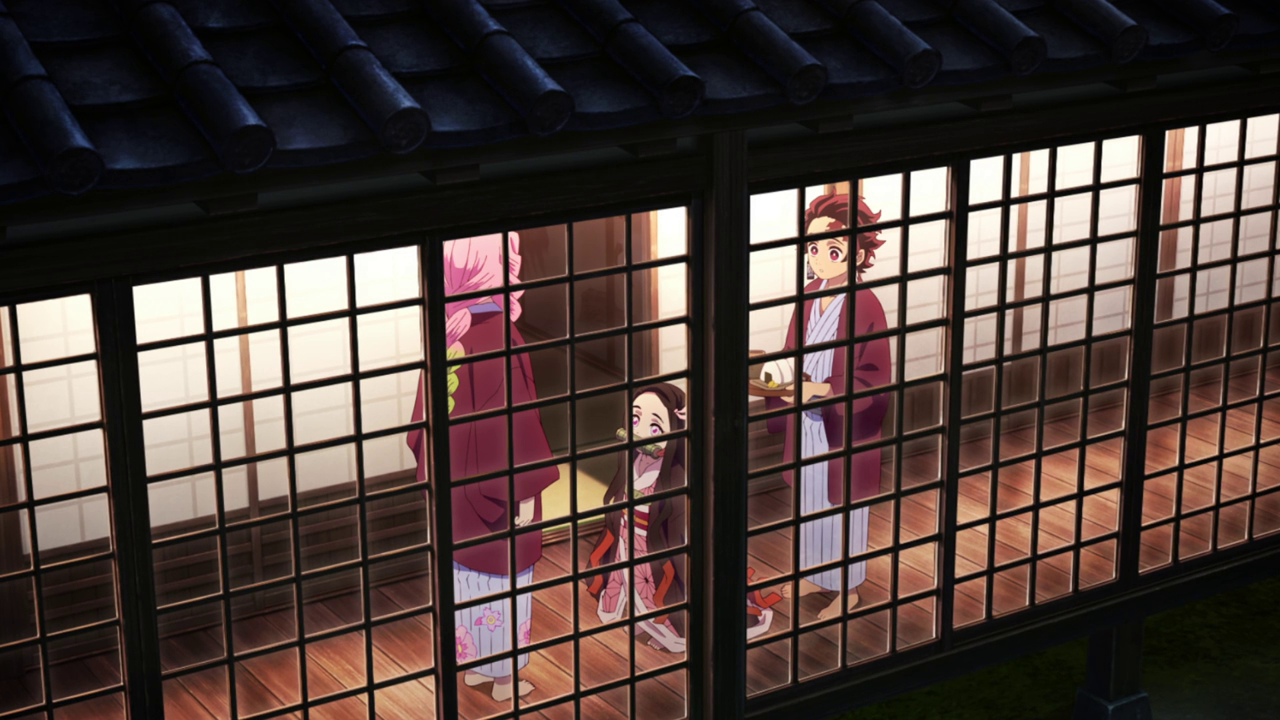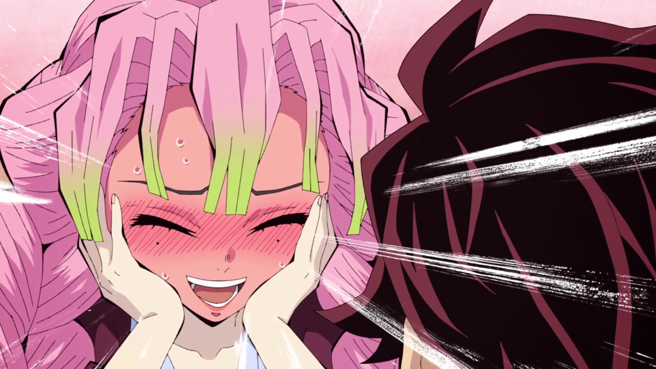 Another character standout from this episode was Mitsuri and… she is certainly a lot in more ways than one. So far, she’s literally like 100% or nothing when it comes to her and it can definitely be quite overwhelming due to the energy she’s exuding a lot of the time. However, I did like the more calm moments with her, especially when she seemed to bond pretty fast with Nezuko which was extremely adorable. It’s like Nezuko could already sense she was a good person and instantly took a liking to her. Most likely adopting her as her older sister with how attached she got to her lol. And considering how many siblings Mitsuri grew up with, it’s not surprising how well she was able to get along with Nezuko. That side of her is really endearing so far since I’m always a sucker for family oriented characters. And I do think it is worth noting that she by far is the nicest out of the Hashira’s right off the back. Though it does strike me as odd is that she only joined the Demon Slayer Corp to find a man. Which I mean, sure, if that’s what she wants, fine, but compared to the other Hashira’s reasons for joining, hers sounds a bit… odd for a lack of a better word. Hopefully there’s more to her than that since that would leave her quite shallow. Though it does show a little bit of hindsight in that despite how seemingly flimsy her reasons for becoming a demon slayer is, the fact she became a Hashira is a testament to her strength. With what she had to tell Tanjiro in the hallway about being a demon slayer, she does hold a lot of insight on the matter while also being encouraging. And judging from the opening, there are definitely more things to learn about her. So I’m definitely excited to learn more about her as a character.