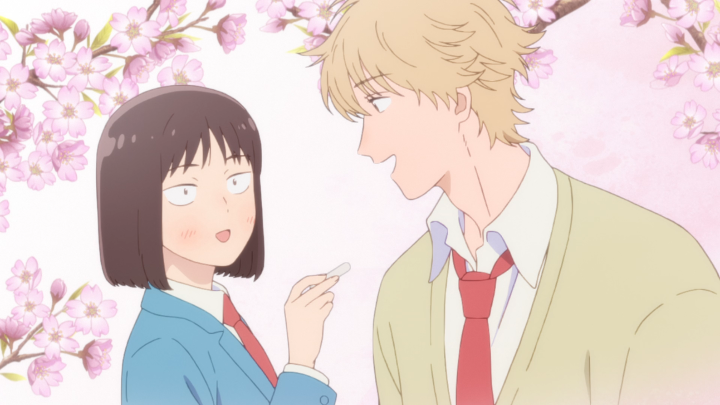 The first portion of the episode is spent doing karaoke with the classmates at the suggestion of Mika Egashira. Mika currently seems like she might take on the mean girl type as she’s using Mitsumi to get closer to Sousuke rather than actually being her friend. And I get it, we need mean girls, but I like that she’s not outright vicious about it. She plays nice. Sure, she’ll make off-handed comments or try to convince Mitsumi that she’s not special… but I think the two of them have potential to be good friends once they remove the whole “I’m doing this for a boy” situation. Plus, Sousuke was pretty blunt in telling Mika to chill out. So I’m excited to see where that goes. The other notable karaoke participant is Yuzuki Murashige, the beauty queen. Her stereotypical role might be someone who is too cool for school or perhaps one of the mean girls, but truthfully, she’s the one that steps up and helps out Mitsumi. She doesn’t directly call out Mika, but she points out those behaviors – unfortunately, it causes some internal conflict for Mitsumi, but Yuzuki isn’t malicious with it. It more so seems like she’s helping out before things can get worse. Yuzuki is also the first to laugh and express joy during Mitsumi’s song, and also is the one to step in when Kanechika-senpai comes bursting into the room with roses. I’m curious to know more about her and I hope that we are able to become good friends with her (and also Kinomoto!)