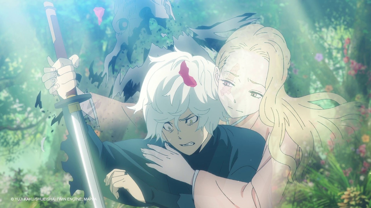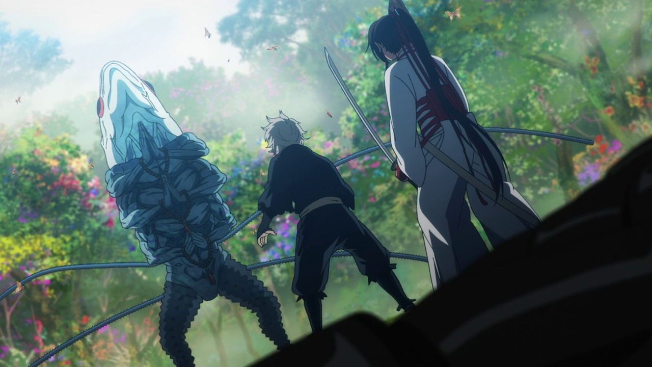 The only difference was the people they grew up with. For Sagiri, while it was rough for her, she still has people who guided and cared for her, preventing her from becoming a heartless murderer, which also contributed to her hesitation and fear whenever she has to kill until she accepted this fear as part of her in the previous episode. Gabimaru, on the other hand, lived as an obedient shinobi who unquestioningly followed orders given to him, thus, earned him the nickname Gabimaru the Hollow. It was only recently that he started to rekindle his humanity after meeting and falling in love with his wife. Thanks to their respective realization, both Gabimaru and Sagiri found themselves hesitating when they were fighting against each other. Their clash brought them to a moment of epiphany where they understood that Gabimaru was no longer the same man he used to be and accepting their emotions is not a weakness but another form of strength. I couldn’t express more into words just how excellent MAPPA animated the moment between Gabimaru and Sagiri where they finally agreed to work together.