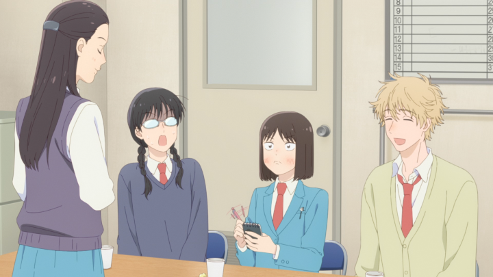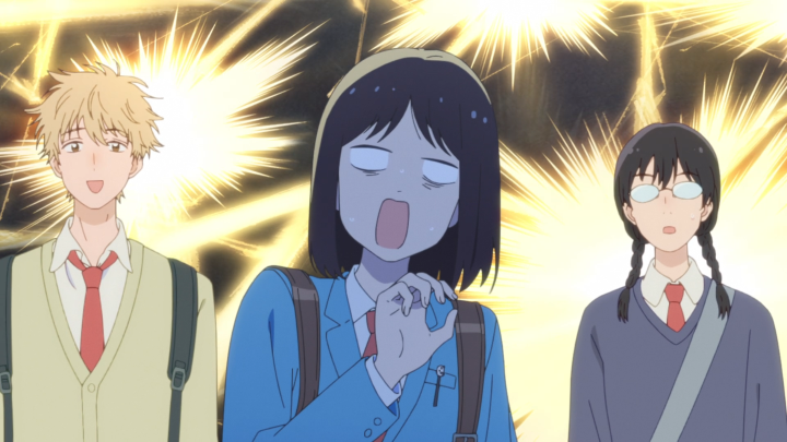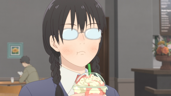 After last week’s episode, Mitsumi has made the declaration to join the student council and to her surprise Kurume is also there to check it out. They both have very different reasons for stopping by. Mitsumi is using it as a means to help her future goals whereas Kurume is hoping to find a collection of like minded people before she’s left in the dust in her high school years. Once they step into the office, it is noted that the student council isn’t actually recruiting any new members which is a huge blow to Mitsumi. Still, they do recommend her joining one of the support groups and they are also able to give her more information about what it actually means to be on the student council… rather how much time it takes to be a member. It’s a wake up call, but she still seems invested. Afterwards, Mitsumi ends up inviting Kurume and Sousuke out to Starmax. And even though cafes are a pretty common hangout spot, it’s just so refreshing to see how excited she is to just be in the space and try one of their special drinks. It seems so mundane and normal to everyone else, but her smile is just so infectious!! Mitsumi, I hope you’re never sad during the course of this anime because you are an absolute ray of sunshine.
