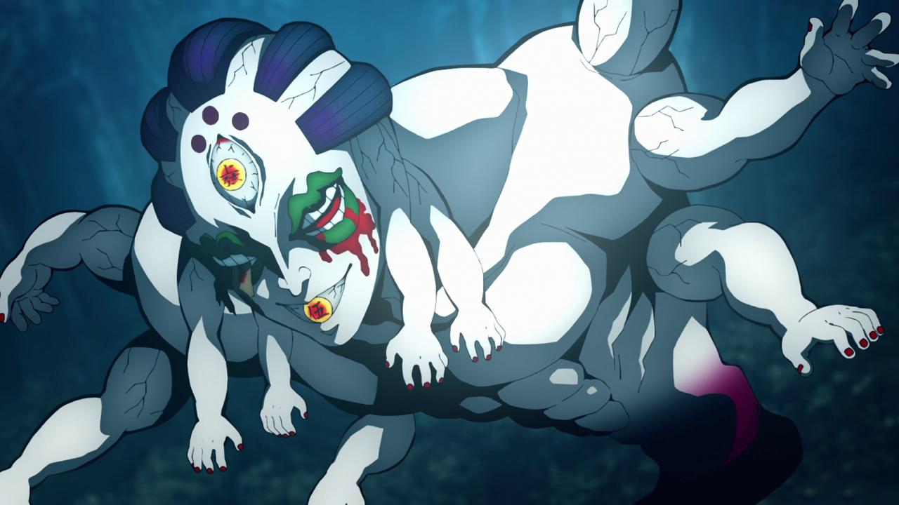 At first I thought it was just going to be another Daki and Gyuutaro situation, but it ended up being infinitely worse. I did accidentally see that Hantengu had another form, but I didn’t realize that he literally is like a hydra situation where whole new bodies just form from the severed parts. And all of these different bodies have different abilities, making them hard to deal with. Especially since they just keep growing in numbers if someone cuts off their heads. Also, while I know that Tanjiro will be fine, I felt actual terror when he was about to hit him again with that screech attack. Also, I totally didn’t realize that a freaking head sprouted from the leg at first. I thought he came back down to finish the job, BUT I GUESS NOT. That is legit horrifying. Due to the form change, I do rescind my former dislike on Hantengu’s design lol. Also I just realized that in the form we were introduced to the Upper Four didn’t have the Upper Four in his eyes but once he split apart, the number became visible. Which makes me wonder if that previous form of his wasn’t his true form? I am very interested in knowing more about this Upper Rank now that he has shown us what his true power is.
