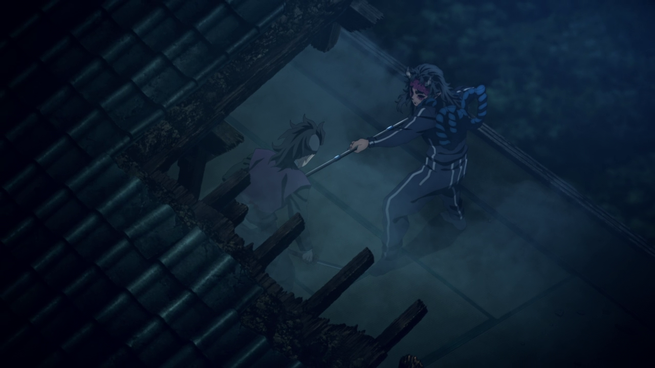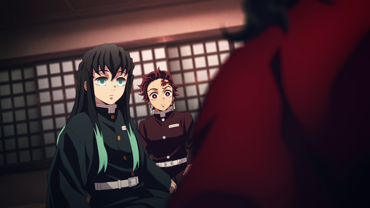 Speaking of mysterious, there is obviously SOMETHING going on Muichiro. Funnily enough, I literally just noticed how in some shots in the opening, Muichiro has some light in his eyes while normally he doesn’t. And before I could ruminate on it, they actually address it, well kinda, in this episode where there were a couple instances where light returned to his eyes. The way he reacted to what Tanjiro said felt like he recalled something familiar, but a second later he was back to his regular self. And then again when he was running through all the high priorities rather than take the time to save Kotetsu, when he recalled Tanjiro’s words, he actually stopped and saved Kotetsu. At first I was like: You better turn around and save him or Mitsuri come in to save him instead. Thankfully it was the former, which makes me a lot more curious about Muichiro and his circumstances. While I do know a little about it because of spoilers, but I don’t know the full extent of it. So it’ll be interesting to watch things unfold and learn more about him. Though it was really cute and hilarious how he just had this head tilt and contemplating expression on his face with Tanjiro and Nezuko doing the same.