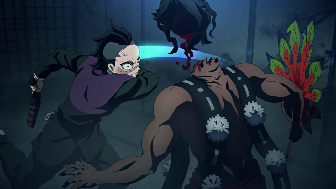 But holy crap, even if he was crying, to have a demon that they didn’t even sense until they saw him and that’s not supposed to know about the village just slowly crawl into the room like that… that was freaking scary. I really like how that scene was done with everything moving slowly when the realization dawns that there is a demon crawling into the room. An upper rank at that. The momentum of that scene felt so good with how slow it started to the fast paced action and actually cutting off his head fairly quickly. However, because of what happened with Daki and Gyuutaro, Tanjiro has learned not to underestimate the situation even when an Upper ranks’ head gets cut off. And boy was he right when the severed head immediately grew a body and the headless body sprouted a head.