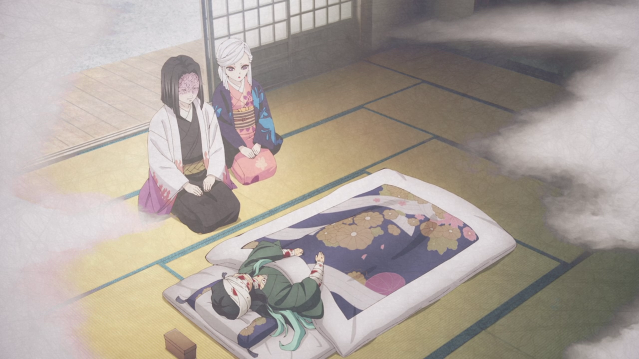We get to learn a little more about Muichiro and his circumstances. While we still don’t know the full story, the guy seems to have developed a form of amnesia where he easily forgets things. I also like the little detail of when showing his memories, it’s laced in this fog/mist, connecting it to his style and just how everything to him probably feels foggy due to his condition. However, I think it’s safe to say that the guy went through a pretty terrible situation to leave him bed ridden and covered in bandages. Because of the Master having taken him and took care of him in this state, it makes perfect sense why Muichiro respects him so much and only got annoyed with Tanjiro when he was interrupting him back during the meeting in season 1. I am starting to like Muichiro with every episode so far. I found him endearingly cute with how contemplative and confused he was over Nezuko in the previous episode. When he questioned himself about whether he would have time save Haganezuka and the village before telling himself he could do it because the Master recognized him, I felt a lot of respect for him. Despite Tengen recognizing him as a genius and everyone around him claiming him to be one, he isn’t conceited and is able to find the determination to get everything done because he knows others, especially the master has faith in his abilities.