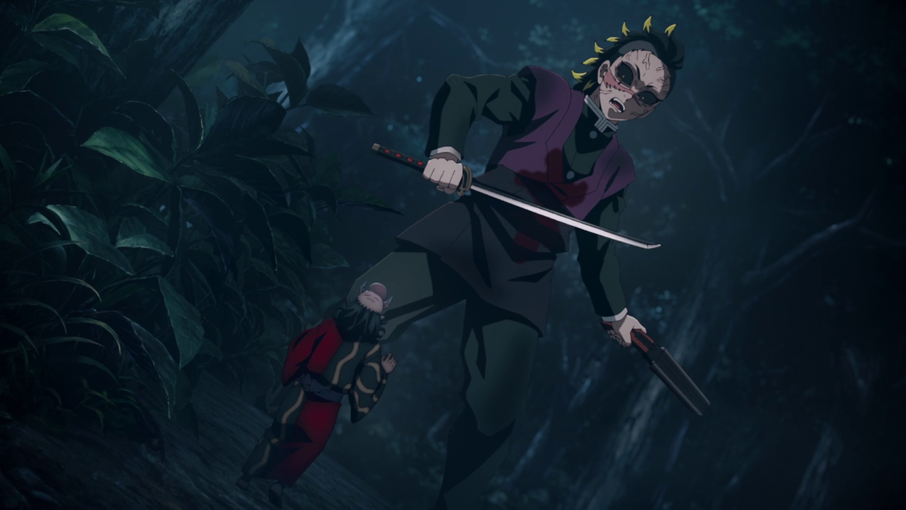And to just throw salt on the wound, he ended up finding his mom dead in front of Sanemi. The fact that his mom turned into a demon and killed her children is incredibly heartbreaking. To make matters worse, in his delirious state, Genya immediately blamed Sanemi for killing her and cried out calling him a murderer, not recognizing the fact his mother had become a demon at the time. And while I do have some issues with Genya’s voice actor, he absolutely nailed his performance and actually brought tears to my eyes just hearing the raw pain and sadness in his voice. I can’t even blame Genya for how he reacted. He was in a state of panic and unable to really think of what was going on. He could only react to what he saw. It’s heartbreaking to see him realize how much he must have hurt Sanemi by calling him a murderer and what he must have been feeling at the time having been forced to kill their mother out of self defense. Genya is trying his absolute hardest to try and right his wrongs against his brother and I can’t help but feel really bad for him. Especially since he apparently can’t use any breathing techniques, which is probably why he resorts to using a gun instead.