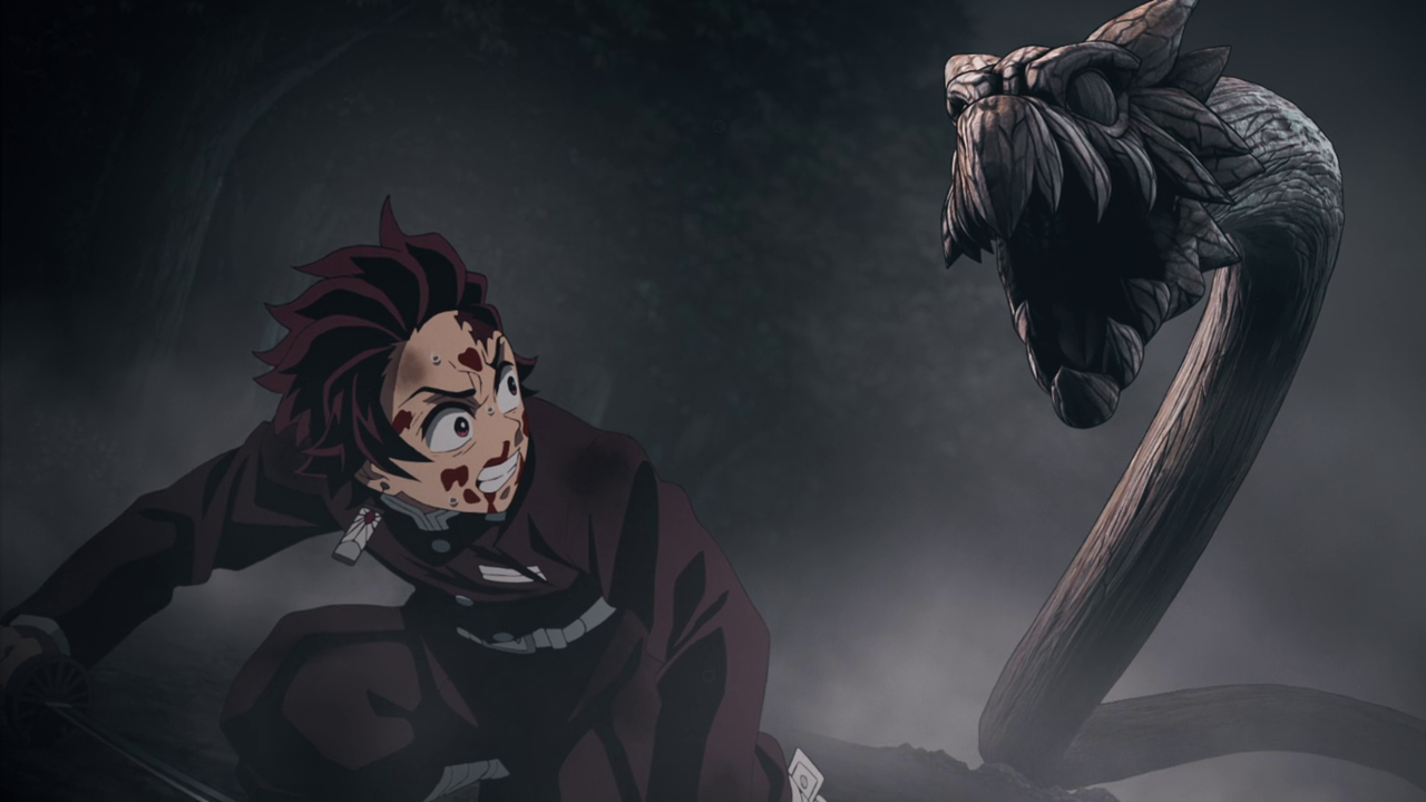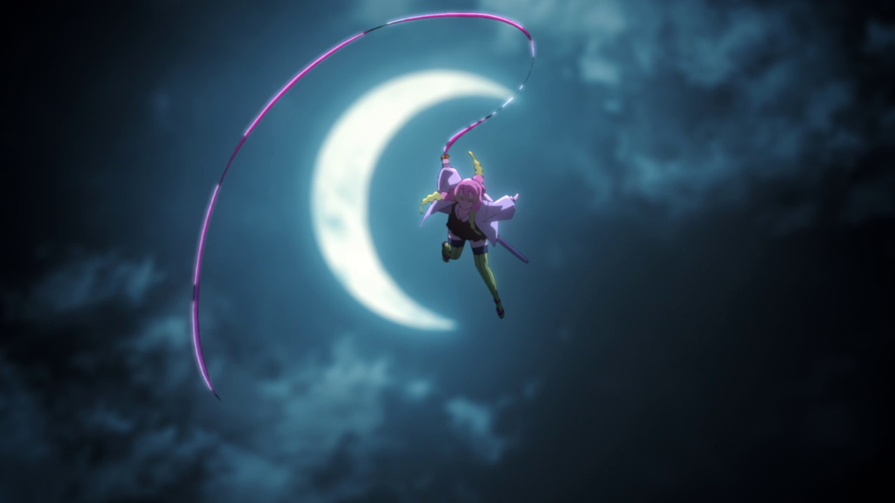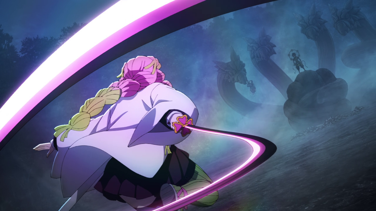 And with that, I think we can finally pass the baton of Hashira spotlight off to Mitsuri now… I think we spent enough time with Muichiro lol. Not to mention that we supposedly only have two more episodes… and we’ve hardly had any Mitsuri focus. Thankfully she’s now officially joined the fray against Hatred as predicted from the opening. But not before Tanjiro getting his foot violently crushed and nearly eaten alive by the wood dragon. The star always has to show fashionably late and what a Sailor Moon entrance she had lol. I’m super hyped to see Mitsuri fight against an Upper Rank Demon. We’ve seen her completely body that giant pot fish demon summon and even her basically taking out a few wood dragons with ease. Also it just feels poetic for the Love Hashira to go against Hatred as those two emotions are often paired together as two sides of the same coin kind of deal. Also I absolutely love her theme music. It fits her so well with the little bit of poppiness to it while keeping to the overall sound of the general OST tracks of the series.
