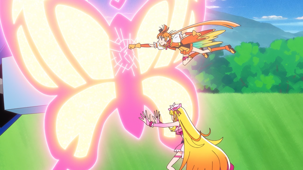 It was also was rather entertaining to see the way Ageha bruise Battamonda’s ego, and the way she snaps back at him with that fierce glares of hers (like seriously, don’t mess with her haha). The only thing I am a bit concerned about is the way they kind of shoehorned this “Exciting!”, which… I noticed they were kind of setting up from the beginning of the episode with the way Sora and Mashiro were almost very animated during her visit, in-fact you could say they were dancing. It seemed a bit much compared to the previous visits. And sure enough, after she became a precure, they all started doing this butterfly pose thing, and I noticed they had established a catch phrase/motto (whatever you’re supposed to call it) for her. At that… I sucked in a breath because I knew what was about to unfold.