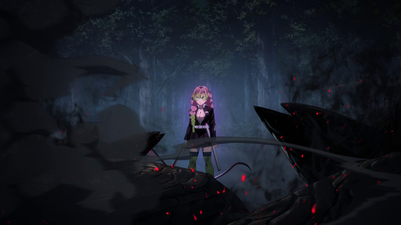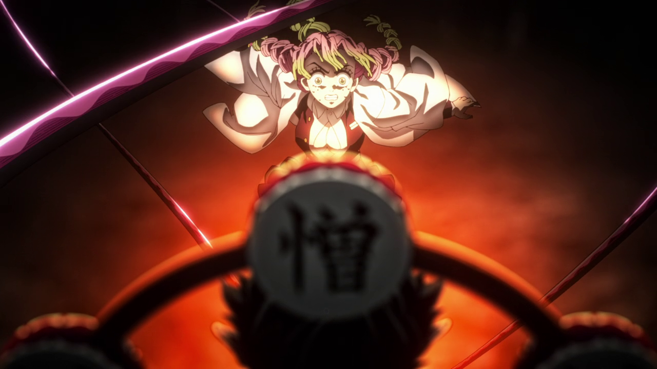 The more I watch Demon Slayer, the more I feel kind of shallow in absolutely loving the incredibly flashy fighting styles of certain characters. Like, Muichiro’s abilities were cool, but I felt like he didn’t have as much of a chance to REALLY show us everything he’s capable of. But then Mitsuri just GOES OFF this episode. “Can I take out this many?” Takes out that many BRUH. I absolutely love Mitsuri’s fighting style. Especially since it’s not the conventional sword fighting. Which makes both her and Tengen’s fighting styles stand out so much. The way she fights reminds me of those ribbon dancers in gymnastics. It has a level of grace and fluidity to it that just makes it so fun to watch. So much that I literally couldn’t catch a good screenshot of her fighting because the shots looked better in motion than it does in standalone shots.