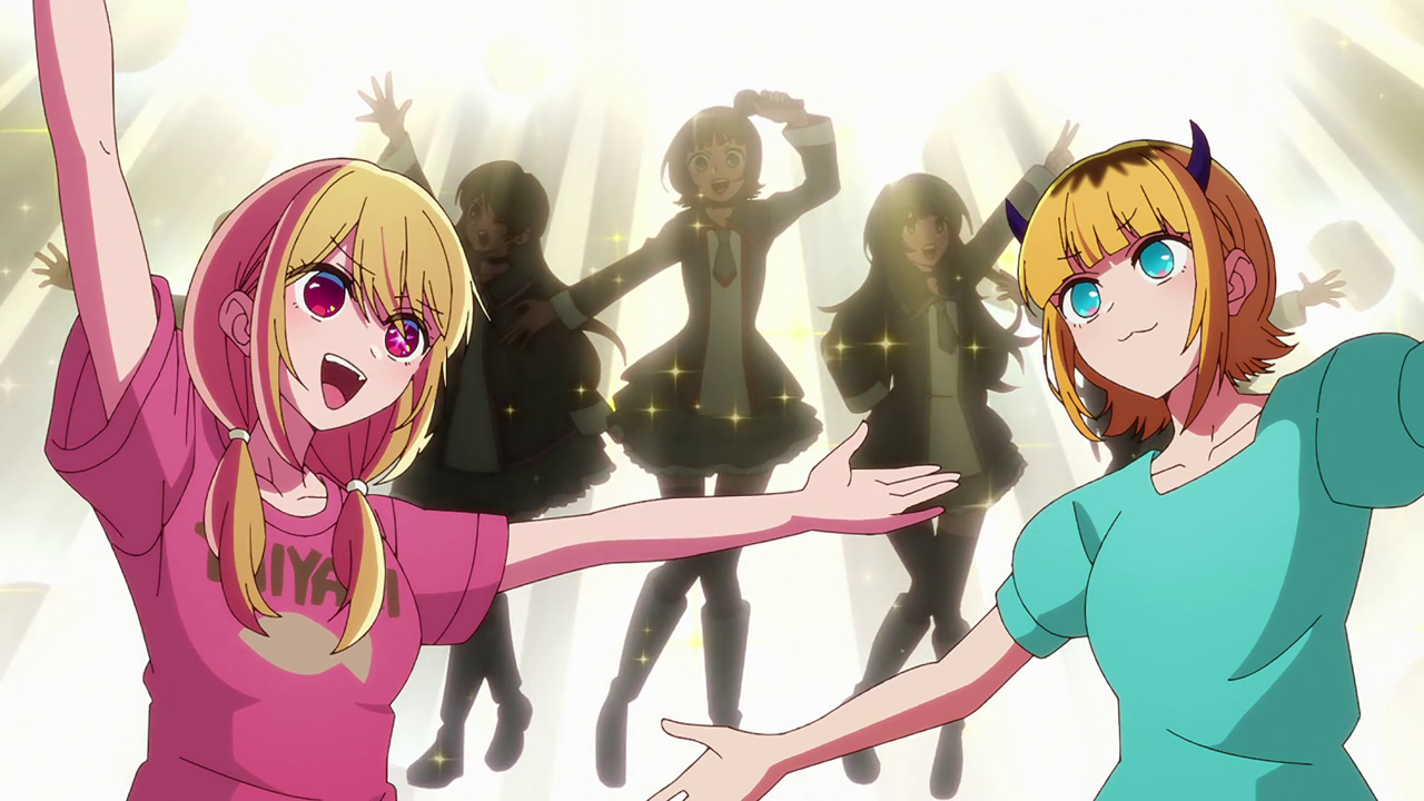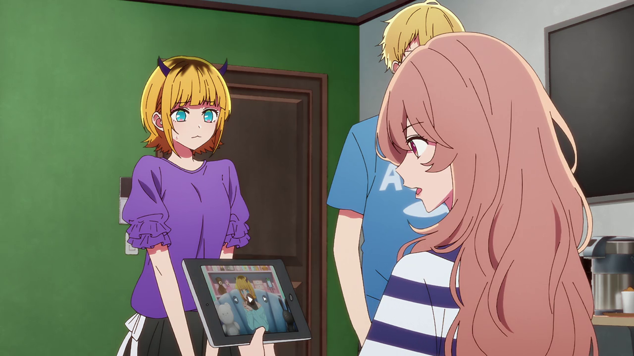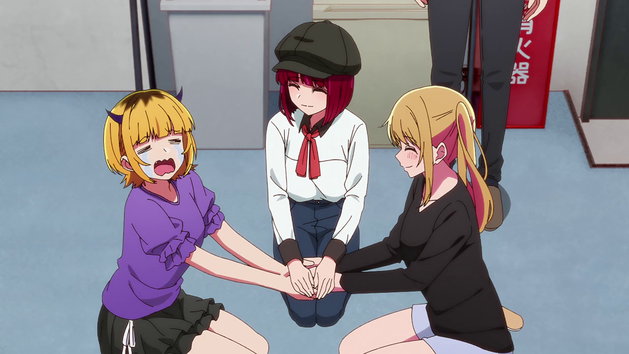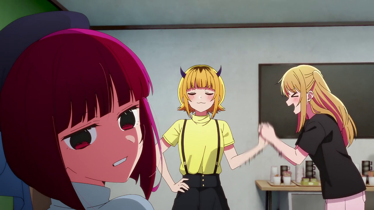 Despite the age discrepancy, they probably hit the jackpot with MEM-cho as a new member due to her being already a pretty big online influence. Not to mention I think her personality is a nice addition to the group. Not only that, but I think I really started respecting MEM-cho as a character after seeing her backstory about how hard she worked to send her siblings to college despite it costing her own career. She’s self-sacrificing, but not to a destructive amount. She was able to find a career she could work with and enjoy. So while she wasn’t able to become an idol like she wanted at the time, she was still able to essentially roll with the punches. And despite not being at the typical idol age, she was given a new chance to follow the career she had thought was just a dream. Which I’m really happy for her. Especially since I noticed that an ongoing theme in this series is giving characters “another chance” in one form or another. In MEM-cho’s case, it is to become an idol. To which both Ruby and Kana are happy to have her part of the team.