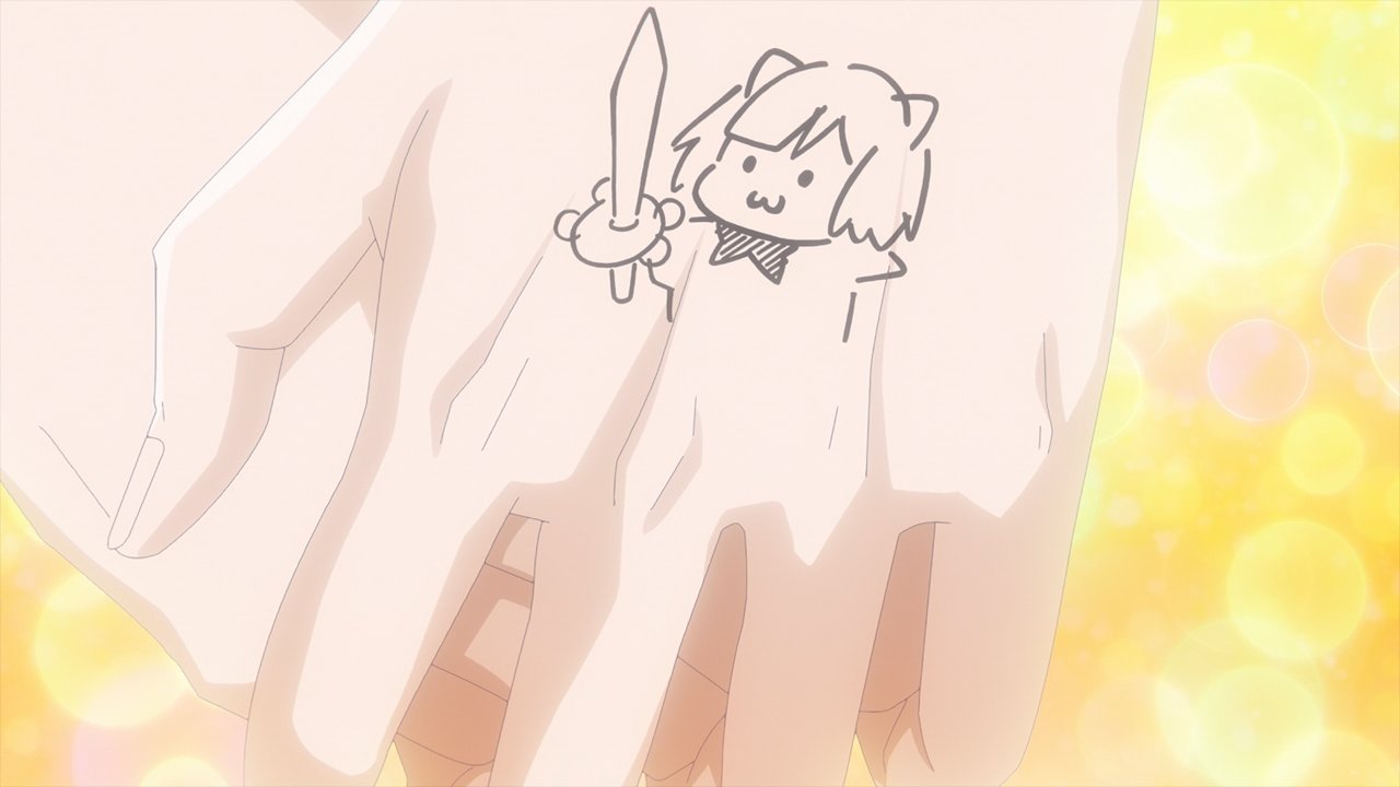 But what he doesn’t realize is that contrary to how he sees himself, there are those who understand him better than he understands himself. Both Eita and Akane recognizes his positive attributes, including his big heart. And I liked the way Akane responded to that grief and explained to him how she knows that even though he doesn’t talk much, he is always looking out for others and sets her straight when needed. I also thought it was so cute how she drew her weapon on his hand (because she actually didn’t know what kind of sword it as hahahaha, bless you Akane) and then her character when she assured to him that he’s a fun guy. You could liken it to a little lucky charm if you will.