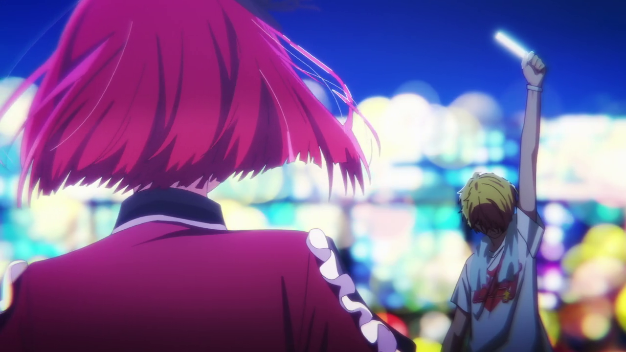 Unlike the previous B-Komachi who seemed to be solely Ai focused, all the members in the new B-Komachi have so much potential to be stars. It almost feels as if they all are able to match each other in possible popularity. Especially with how talented each of them are and the different skills they are able to bring to the table. As soon as I saw the guy with the bandanna, I immediately recognized him as one of Ai’s fans. He was shown several times through out the first episode and even had a close up shot to him shedding a tear after Ai passed away. So of course, I knew he would have something to say about the new B-Komachi. As expected, he felt that group was a far cry from the original. But eventually came to recognize all of them as strong members and also seemed awestruck by Ruby. To which, was pretty obvious since she is Ai’s daughter and it’s possibly he’s subconsciously recognizing her. I also love how it shows a bright star shining in the sky as if Ai was smiling over them. Also can we just take a moment to appreciate that the performance wasn’t CG. Which is honestly incredibly impressive since animating a 2D dance sequence is really hard. Though I feel like they were able to hide a lot of it by the constant camera movement… Which honestly did feel a little disorienting at times.