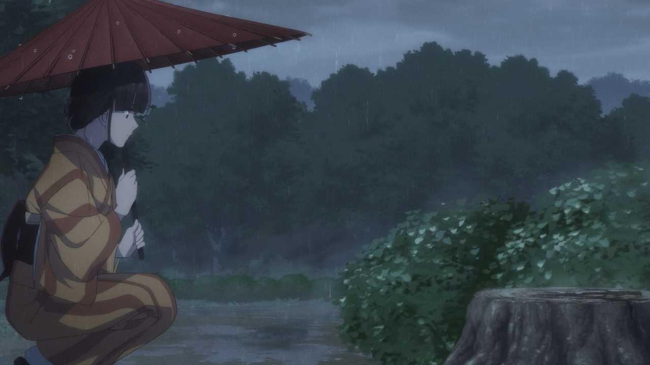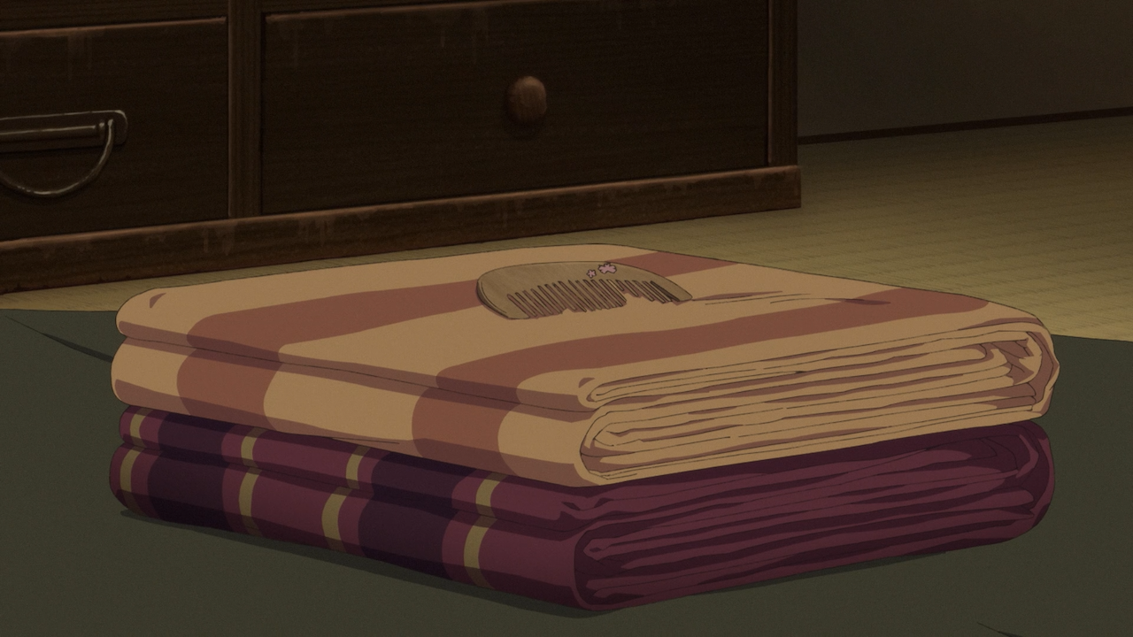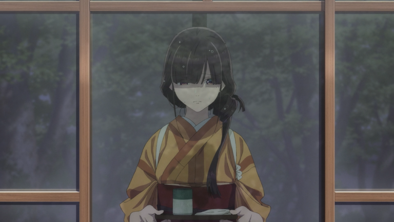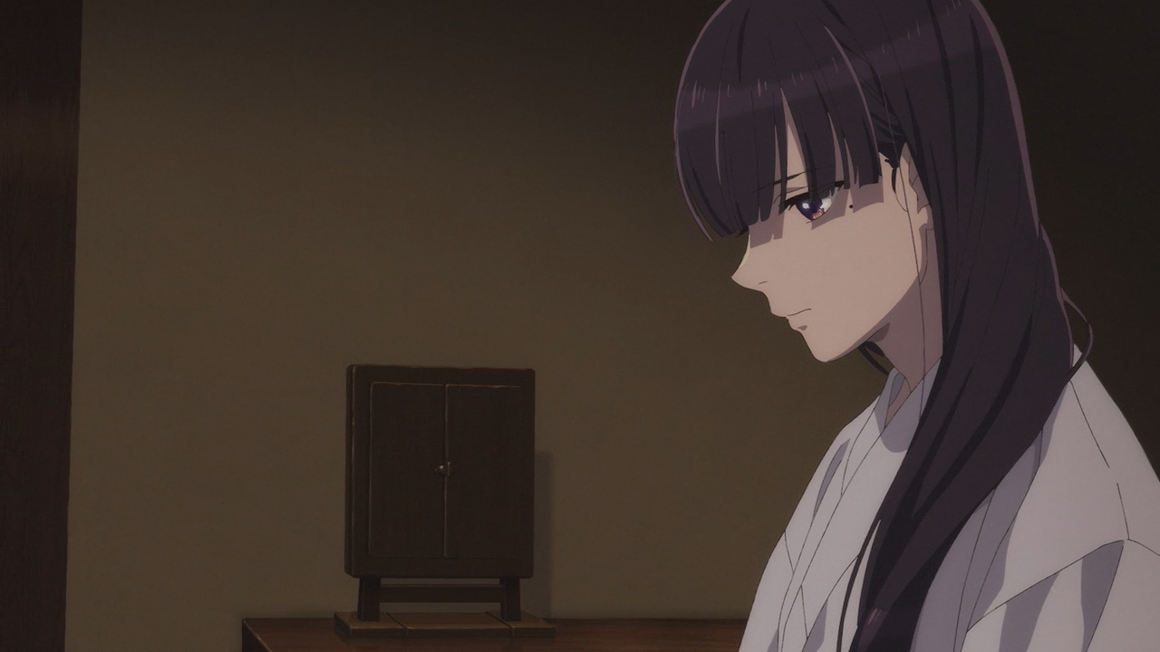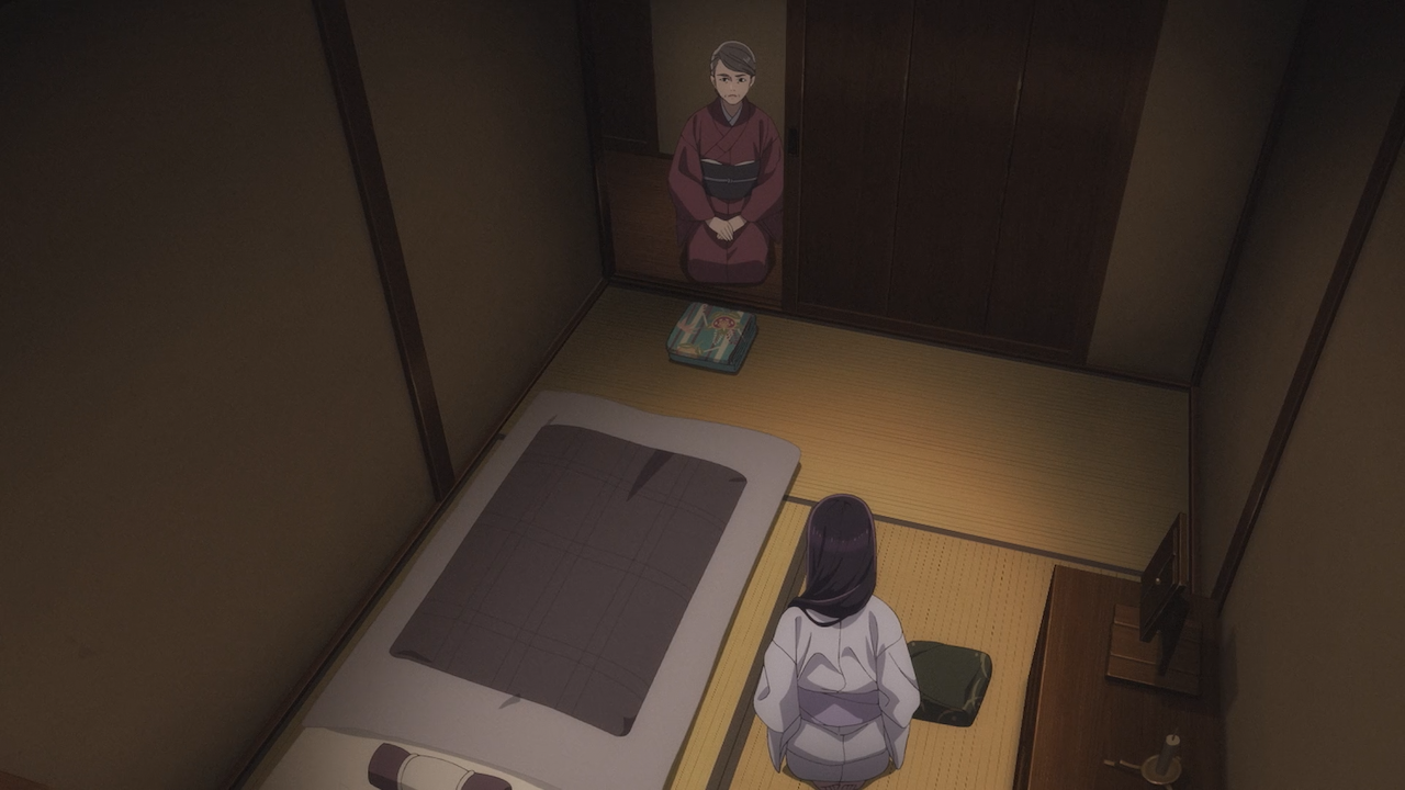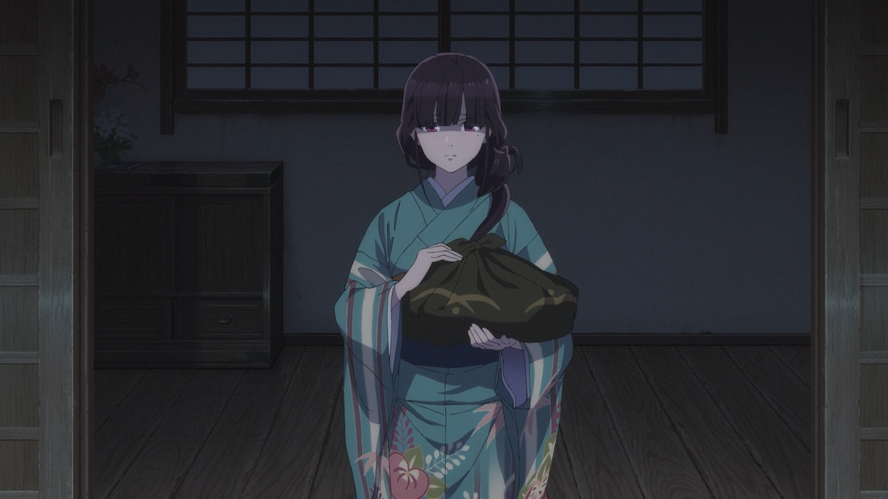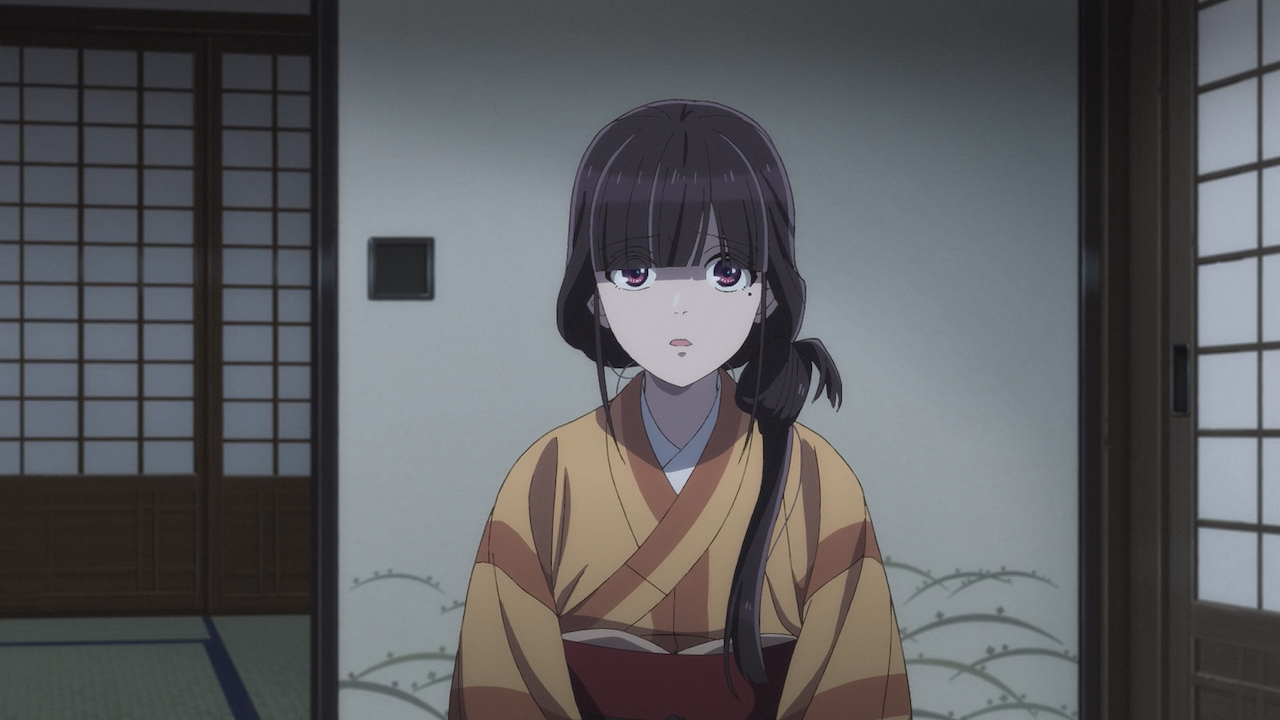 Later into the episode, they began to drop clues as to what was lost in that fire, such as Miyo mentioning she no longer has any of her mother’s mementos, the cherry blossom tree that her mother planted has been chopped down, and Miyo had no belongings of her own. There is more context to be said about these things, as shown in the episode, Miyo only wore two pieces of worn out clothes that were in lesser shape than her fellow servants uniform attire.