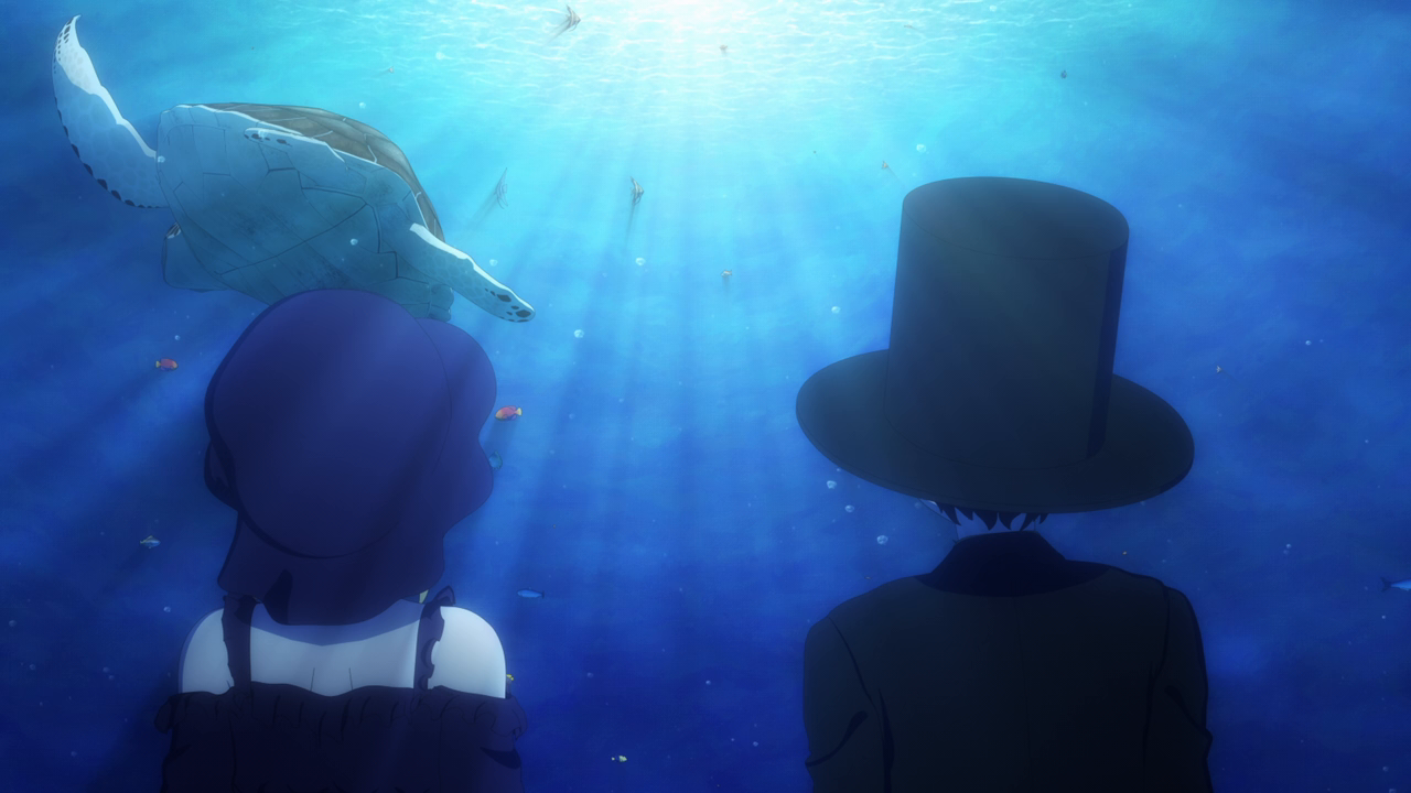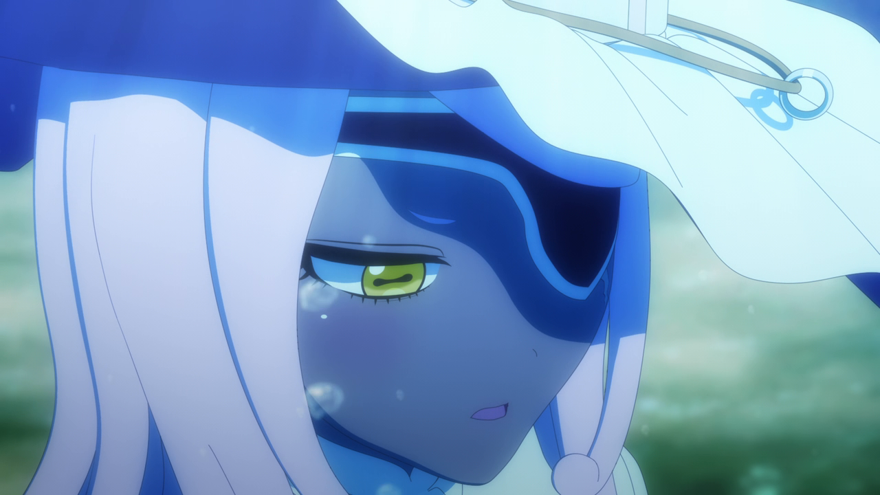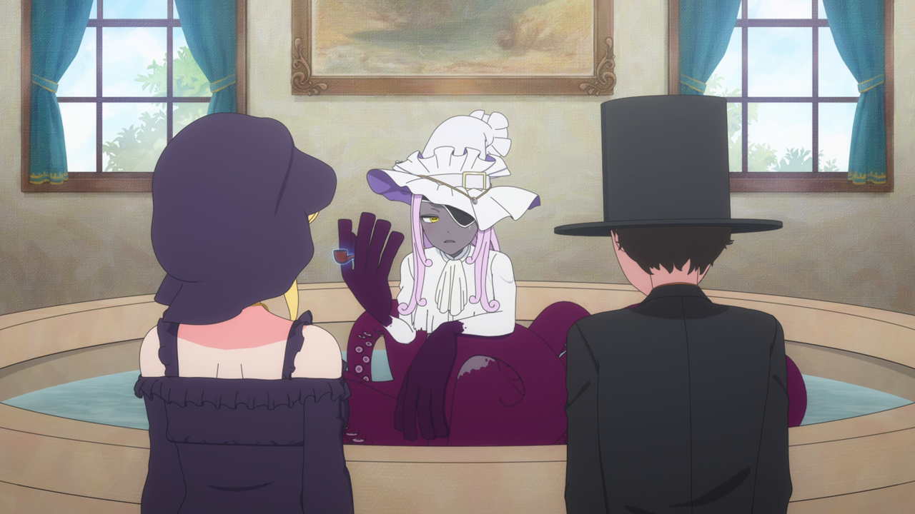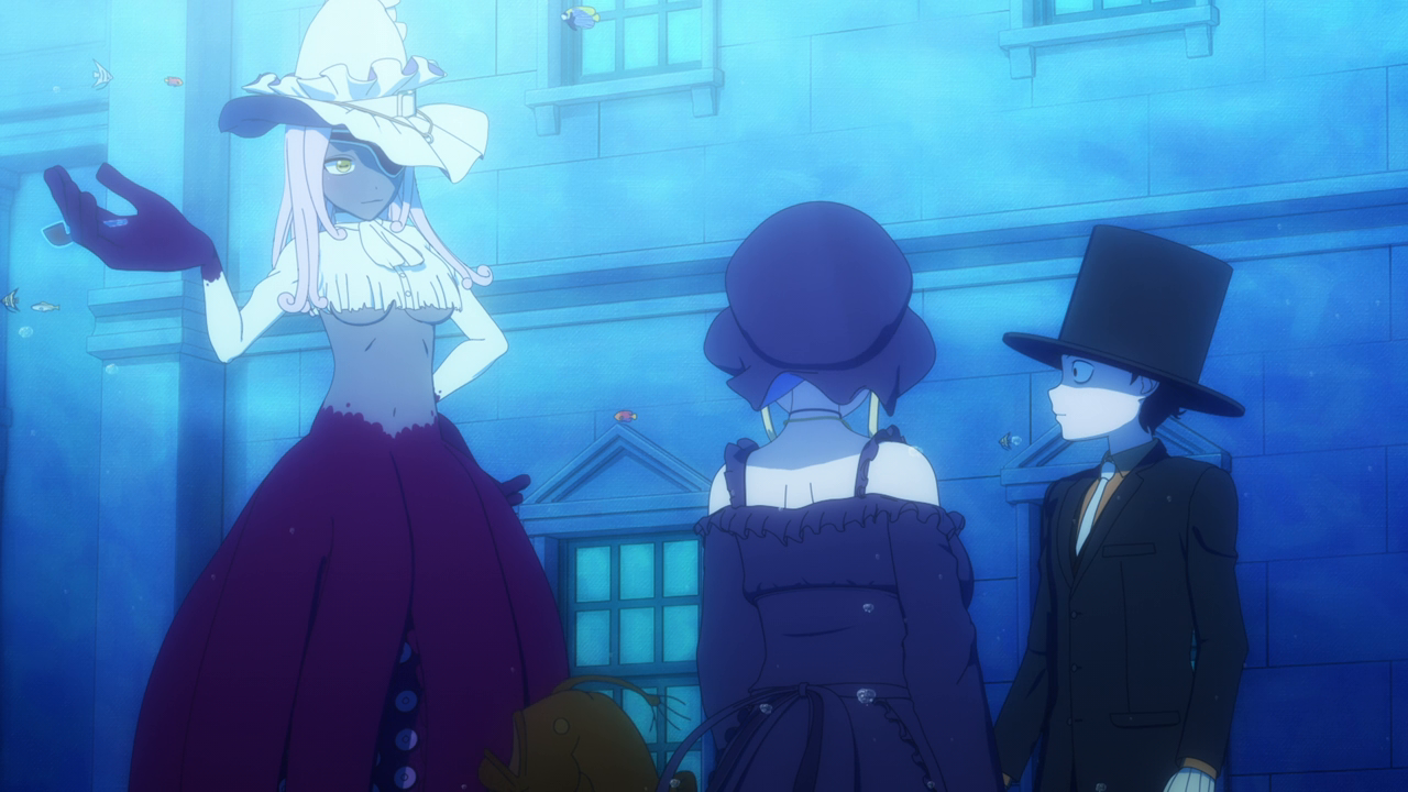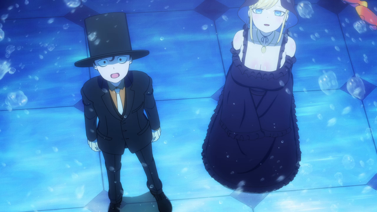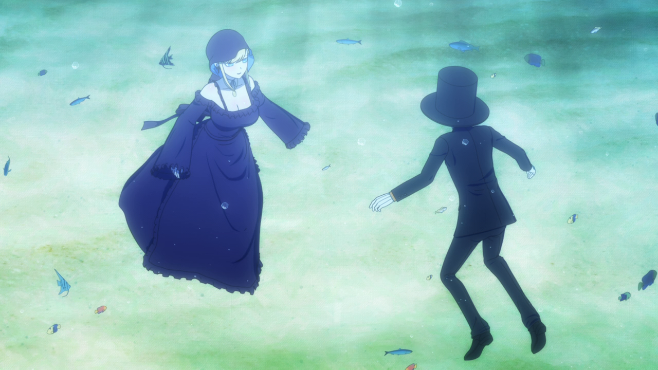 Even though we’ve only spent a little bit of time with her, I love Amelia already. I was wondering what kind of character she’d be, and I was expecting a more ominous character. But man she’s really cute! Even though her design is a little strange. Most of her is super cute but then her giant hands kill the design lol. And while I hate underboob designs, it kinda works with her. But yeah, she looks cute (mostly) and she acts very cute too. I love how she uses her camoflouge technique whenever she gets embarrassed so no one can see her. She’s broken the Duke’s type of curse before so she looked pretty confident that she’d break it. While Daleth sent her out as part of the deal, Amelia seems more relaxed about this and also seems to hold a more positive outlook on Daleth than the Duke. Obviously there’s more to Daleth’s character but we’ve only seen how mysterious and kind of eerie she can be, so I hope we get to see a different side to her soon. To win their trust, Amelia shows off her magic to the Duke and Alice and we’re treated to yet another song between them and just these really lovely moments of them swimming around the mansion with the fish life. Again the animation hasn’t changed too much but they’ve definitely bumped it up for this season. It just gave nice vibes and I was all for it. After they had their fill of fun, Amelia comes down to attempt to break the curse…and of course she wasn’t able to. The curse was so strong that the dark energy from it started to really affect her and basically knock her out. That, and being an octopus, she wasn’t used to being among humans and away from her precious ocean.
