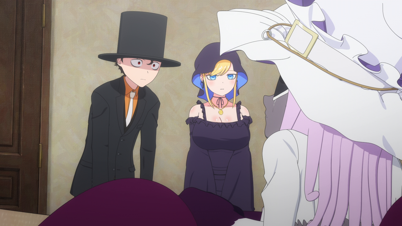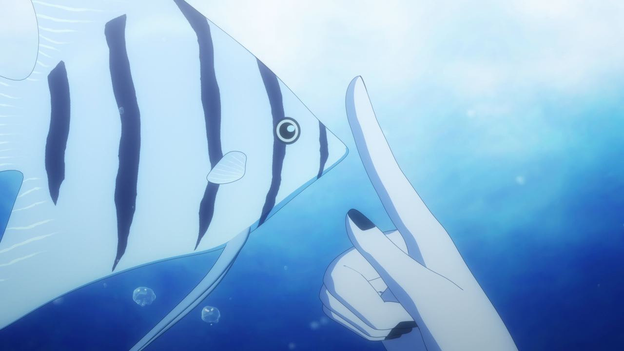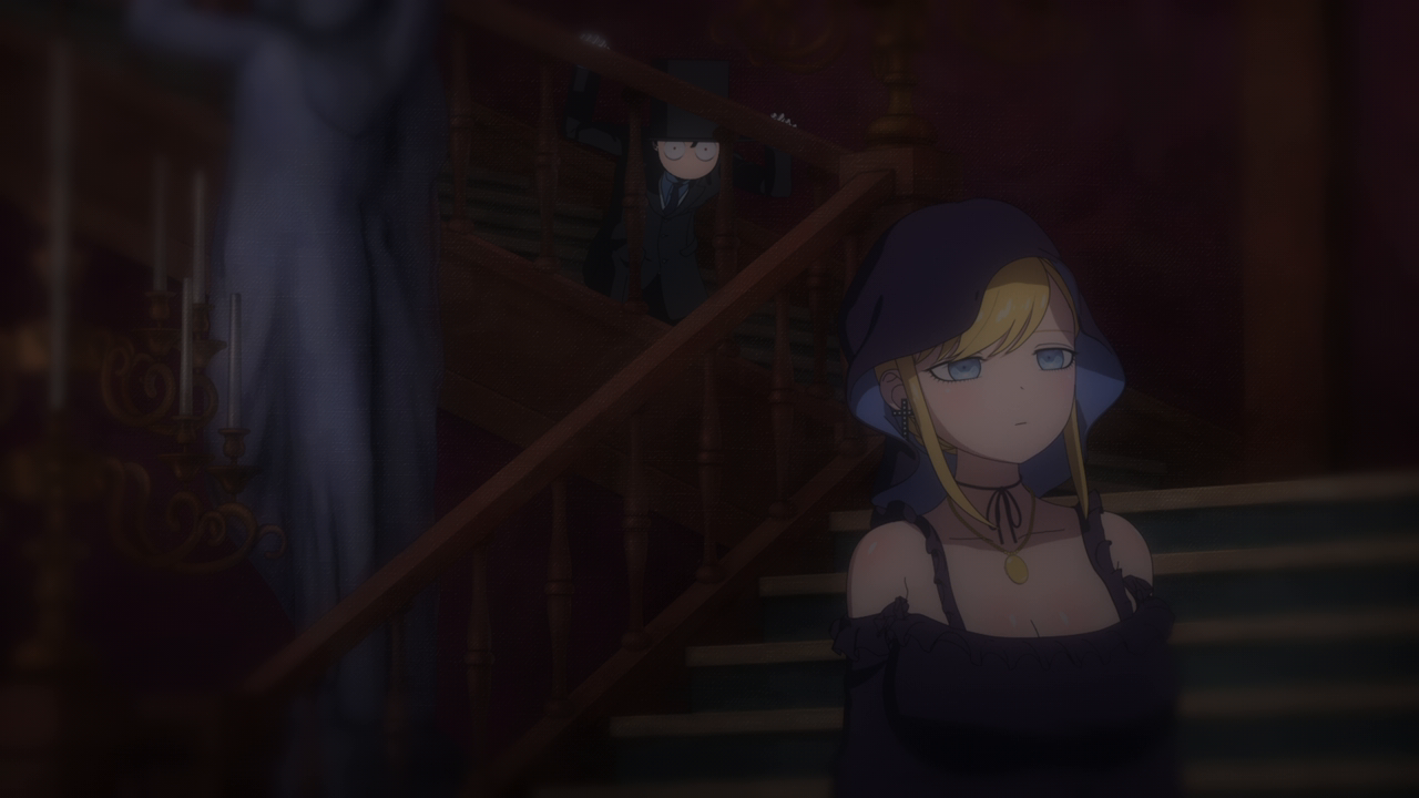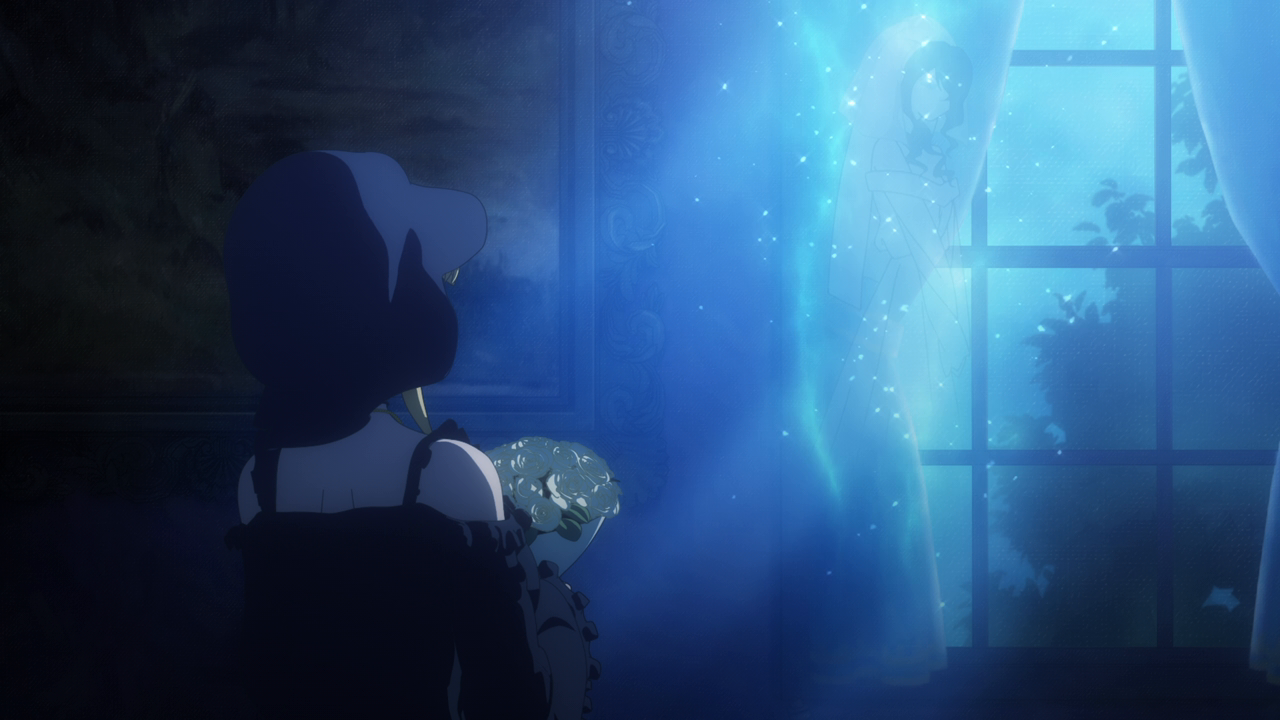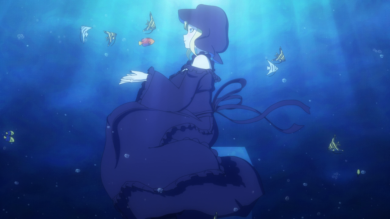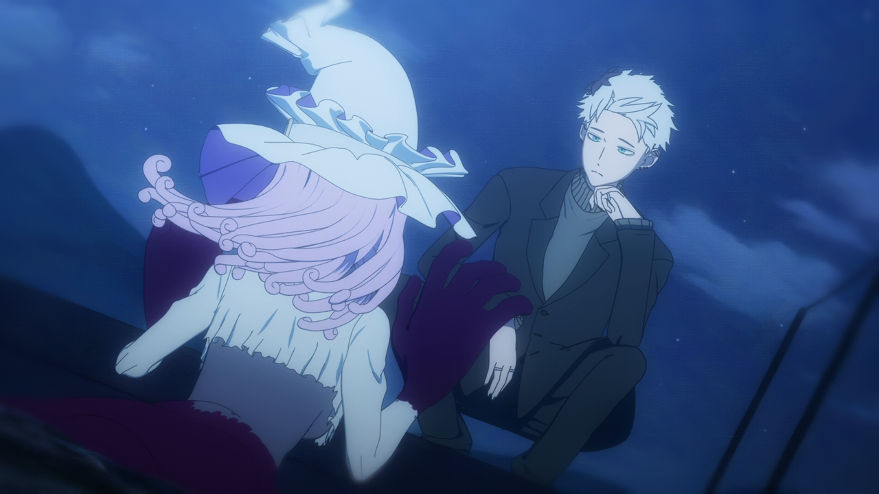 Even though we’ve only spent a little bit of time with her, I love Amelia already. I was wondering what kind of character she’d be, and I was expecting a more ominous character. But man she’s really cute! Even though her design is a little strange. Most of her is super cute but then her giant hands kill the design lol. And while I hate underboob designs, it kinda works with her. But yeah, she looks cute (mostly) and she acts very cute too. I love how she uses her camoflouge technique whenever she gets embarrassed so no one can see her. She’s broken the Duke’s type of curse before so she looked pretty confident that she’d break it. While Daleth sent her out as part of the deal, Amelia seems more relaxed about this and also seems to hold a more positive outlook on Daleth than the Duke. Obviously there’s more to Daleth’s character but we’ve only seen how mysterious and kind of eerie she can be, so I hope we get to see a different side to her soon. To win their trust, Amelia shows off her magic to the Duke and Alice and we’re treated to yet another song between them and just these really lovely moments of them swimming around the mansion with the fish life. Again the animation hasn’t changed too much but they’ve definitely bumped it up for this season. It just gave nice vibes and I was all for it. After they had their fill of fun, Amelia comes down to attempt to break the curse…and of course she wasn’t able to. The curse was so strong that the dark energy from it started to really affect her and basically knock her out. That, and being an octopus, she wasn’t used to being among humans and away from her precious ocean.