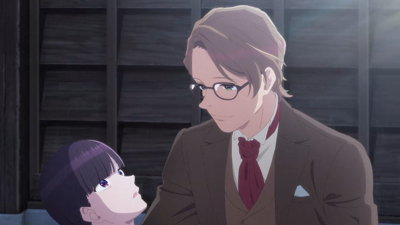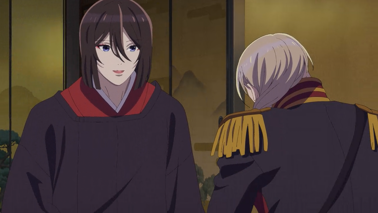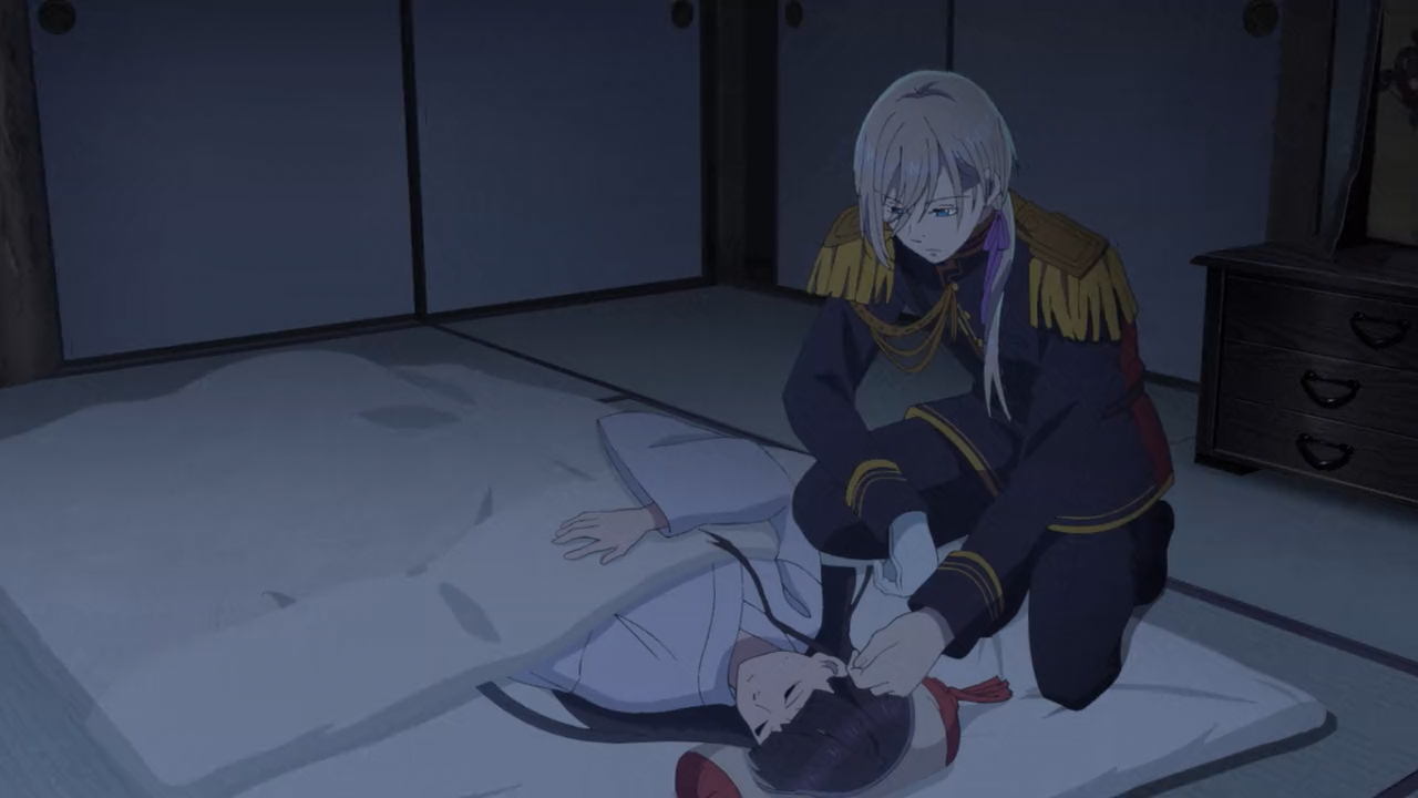 Oh Arata… I’m feeling exactly how I felt about him when he first emerged in the novel all over again, hahaha! He certainly does a good job of leaving a not-so-hot first impression considering he rubbed me the wrong way right off the bat. The way he was talking to Kiyoka about being envious of his engagement, like that wasn’t subtle at all, especially later at the end of the episode, when he refers to Miyo as “my dear”. EXCUSE ME SIR, I NEED YOU TO BACK OFF. Also did I mention that he referred to her name despite the two having never met before? Yeah, talk about screaming ULTERIOR MOTIVES! Also doesn’t help that he claims to be ‘its protector’, sure buddy. Keep telling yourself that. So naturally, seeing him be the one to catch Miyo when she collapsed had that “Ah this little shit” feelings resurface again. Still, better that someone had caught her because that would have been a very rough landing, but we could see that the first person she thought and hoped was Kiyoka– oh the immeasurable disappointment of it being someone else entirely.