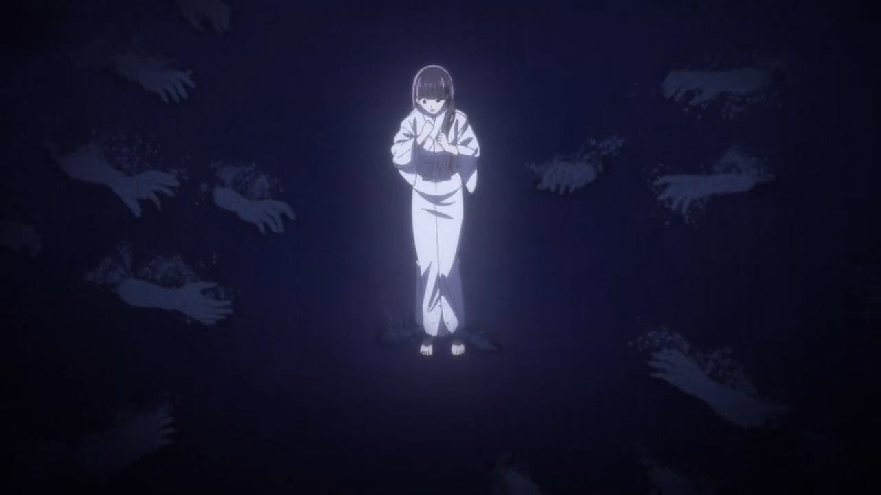 Interestingly, at the exact same time— we did get to see a similar mannerism of perspective with Kazushi (the new head of the Tatsuishi family) when he had to use his powers. His job in the investigation is to remove curses, but the (suspected) curse the Grotesqueries had inflicted onto their “victims” (the perpetrators) causing them to be catatonic, making it impossible to interograte them. But in the end, Kazushi was unable to do so because the Grotesqueries’ powers were far too overwhelming for him to deal with. The fact that Kazushi was able to enter the same sort of “realm space” so to speak as Miyo gives us a hint as to what kind of role Miyo may be playing once she undergoes her ‘awakening’.