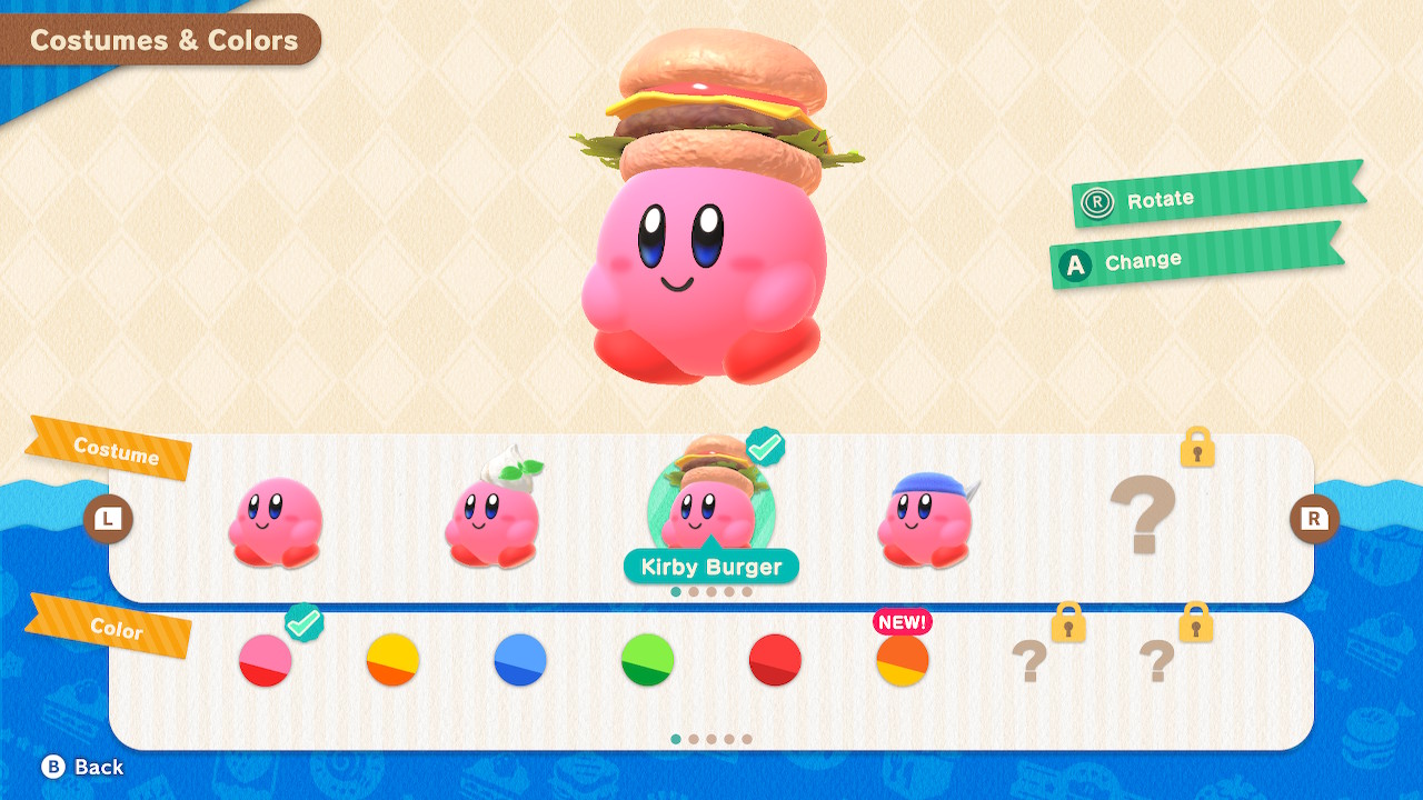 And while you can’t play as any other Kirby except for Kirby, you can still dress up as them through the costume unlockables! Obviously these are my favorite unlockables because you can change your Kirby up and make him look however you want and my god the hats and colors are so CUTE! When it comes to characters you can unlock costumes to make you look like Meta Knight, Bandana Dee, King Dedede, Marx, etc. You even unlock their respective colors to you can really look like them. There’s also other cute and funny hats like the whipped cream hat, burger hat, and the car Kirby cake hat. The other colors based on desserts like chocolate mint, strawberry, and chocolate are also very cute. And again, VERY plentiful. But that’s all the unlockables in general: stages, costumes, colors, treats. I mentioned I’m at a pretty high level but I still haven’t collected all of the colors and costumes which is pretty amazing. Leveling up is pretty easy with how generous the EXP points are so you can unlock a lot of things quick, but again there’s just so much and I still don’t have everything so the sheer amount of unlockables is truly insane.